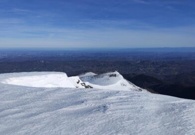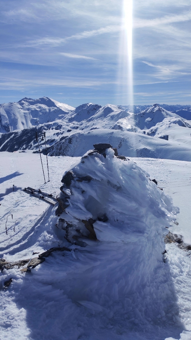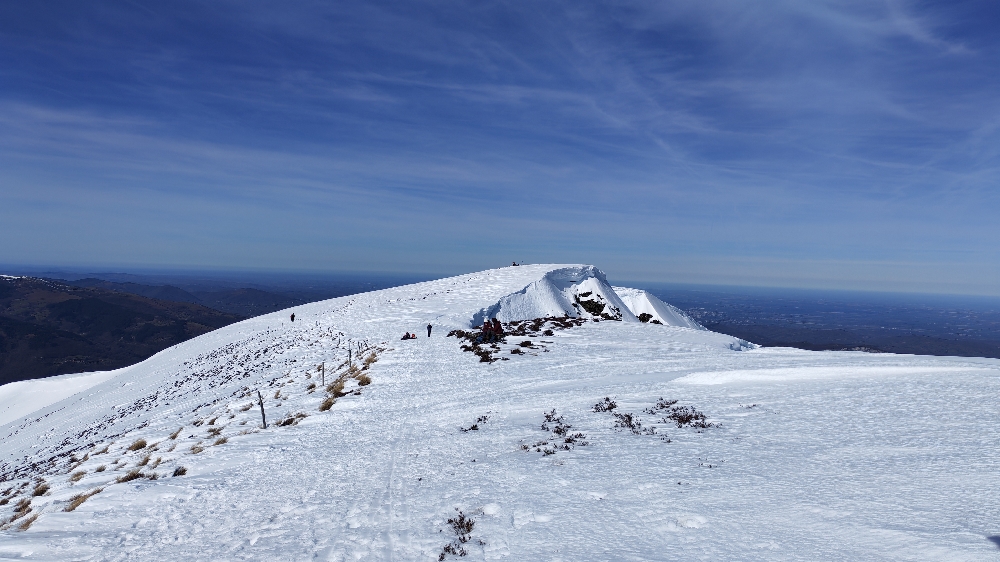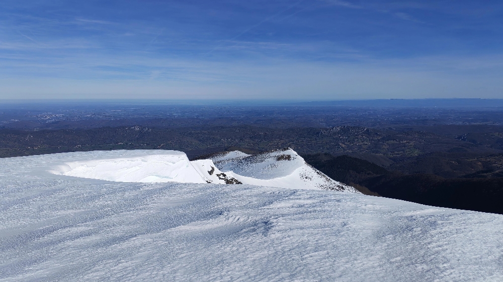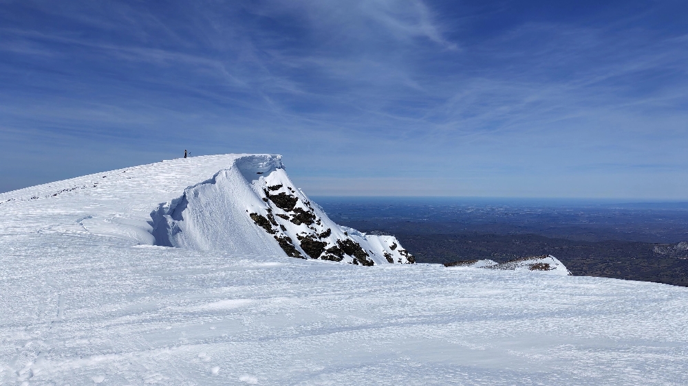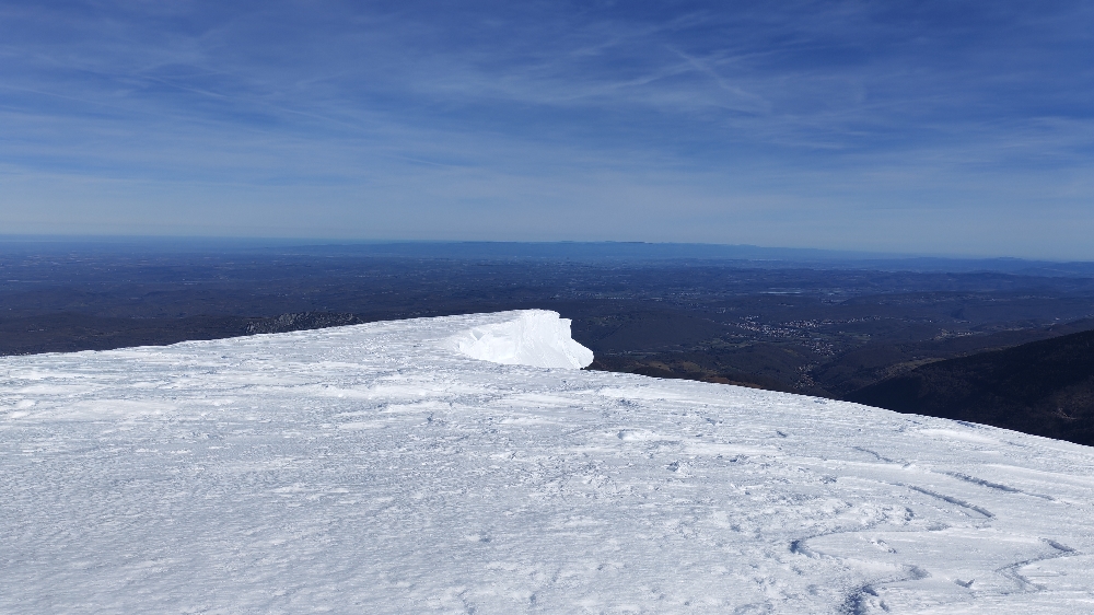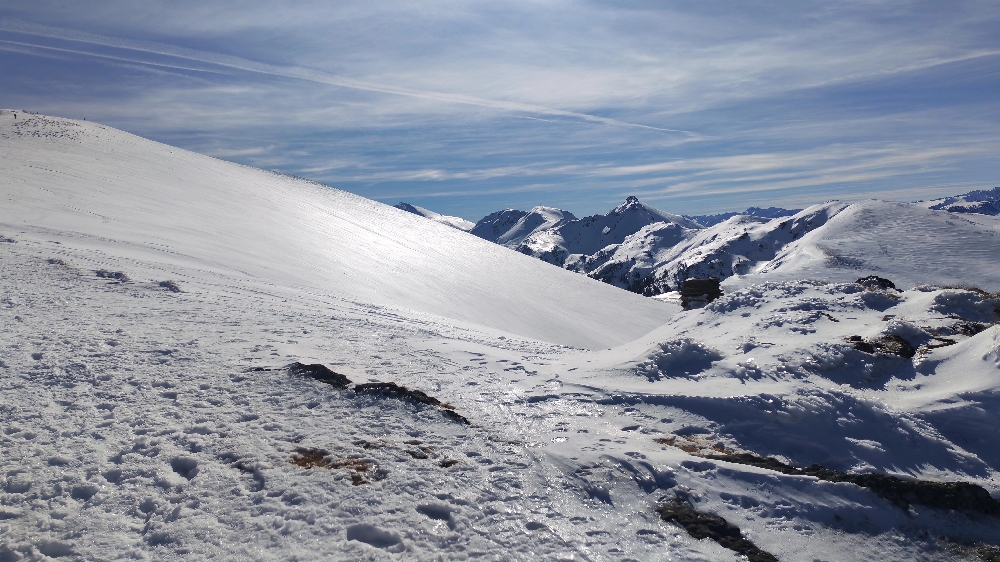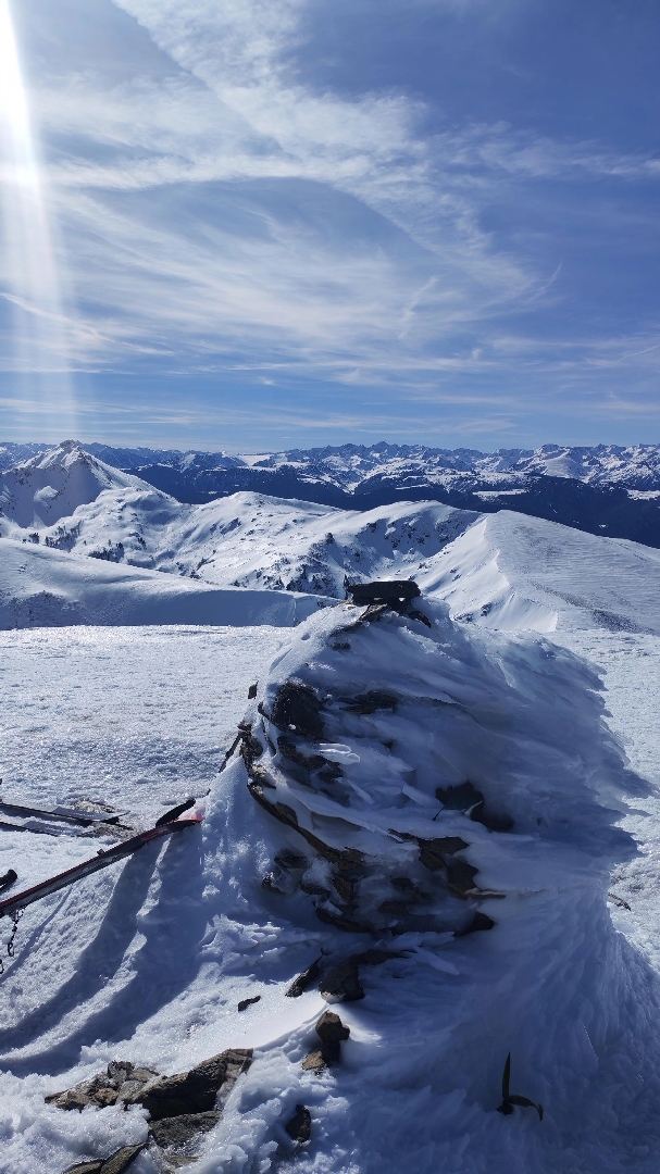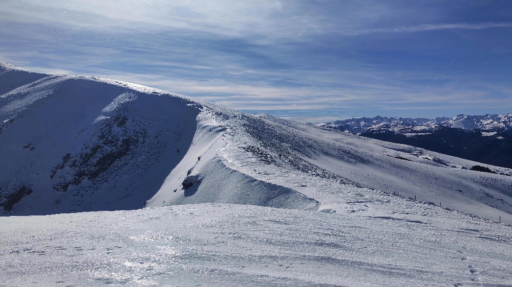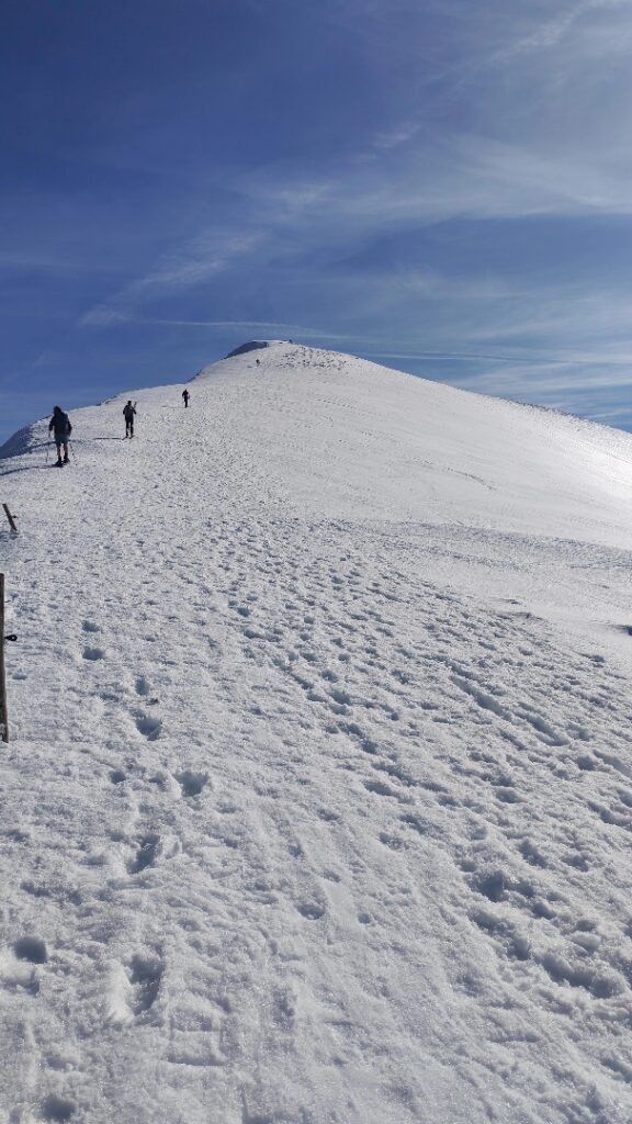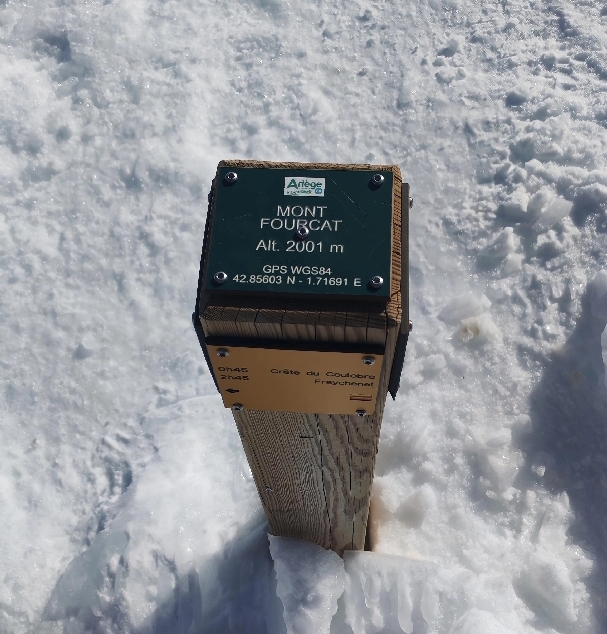 Nous grignotons, puis un dernier effort, toujours sur une neige « porteuse », nous voici au Mont Fourcat (2 001 m), une petite brise nous accueille et les randonneurs/skieurs présents aussi…