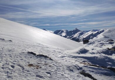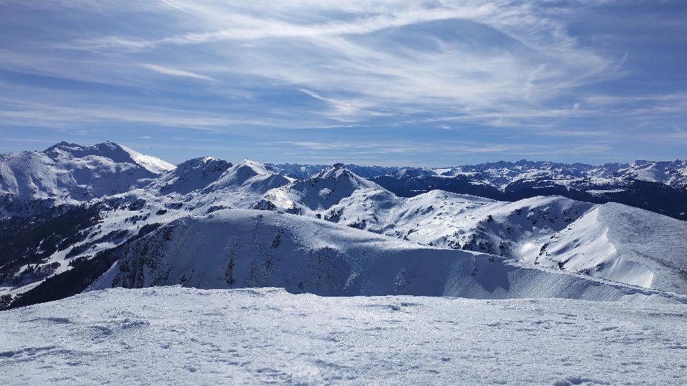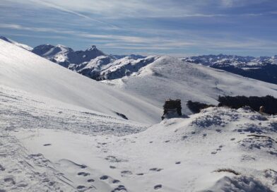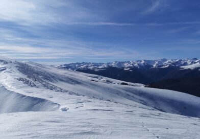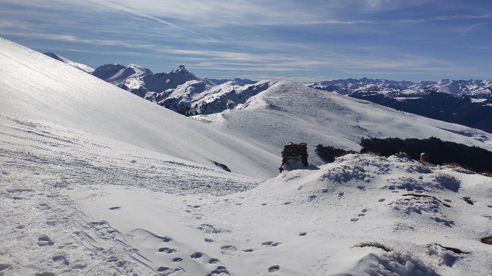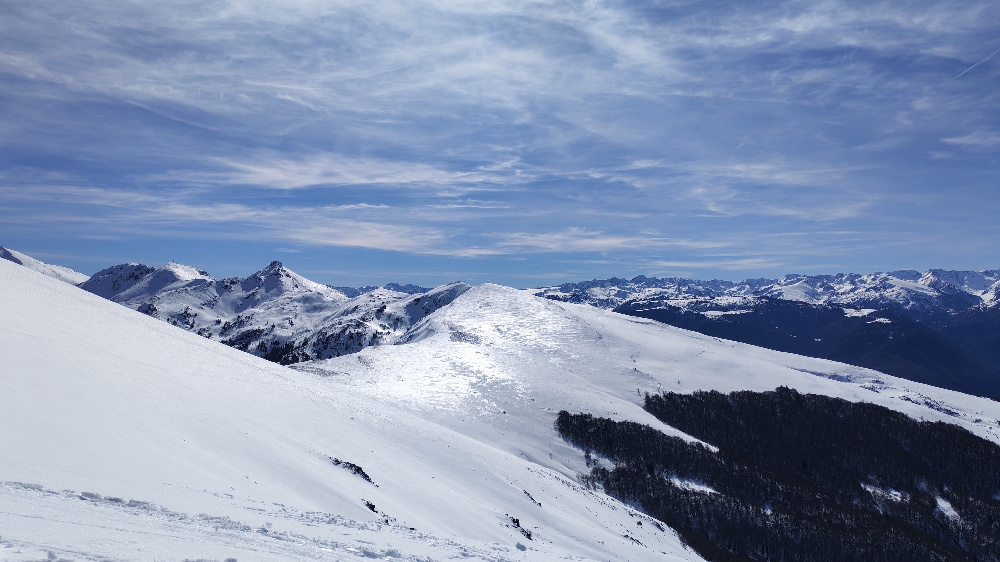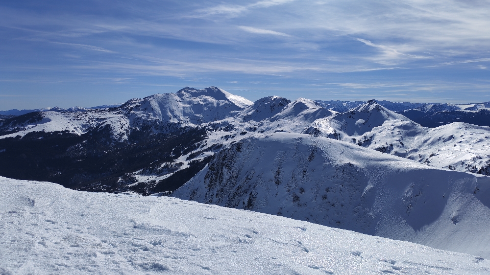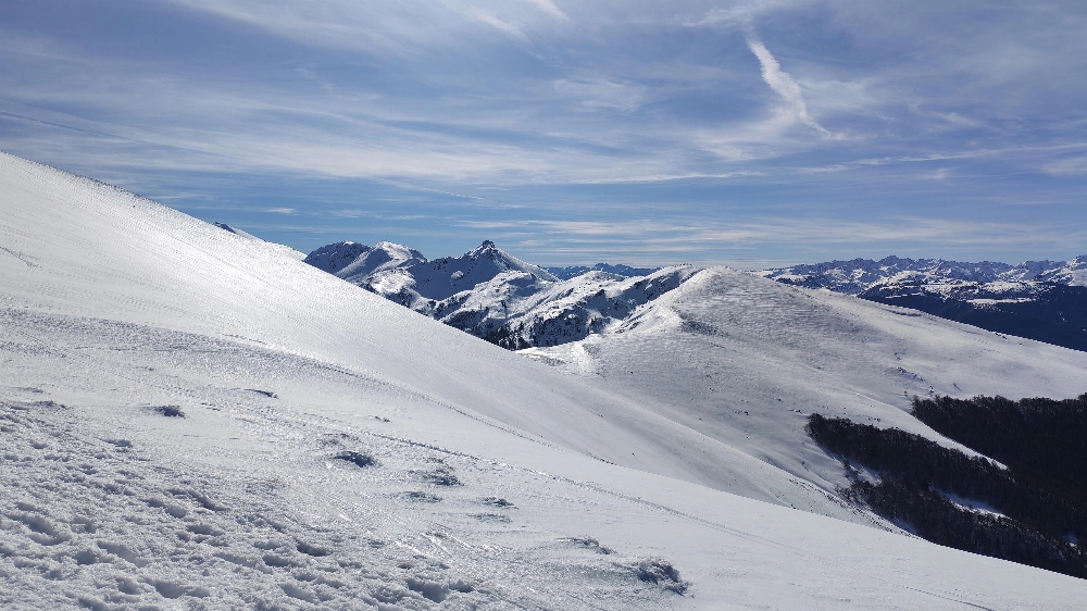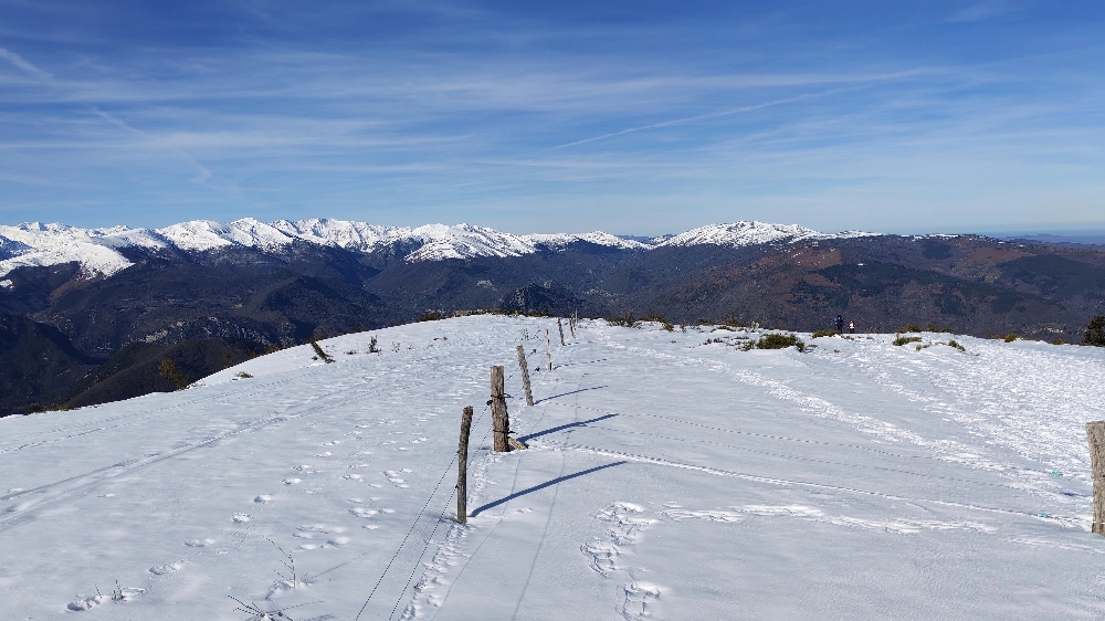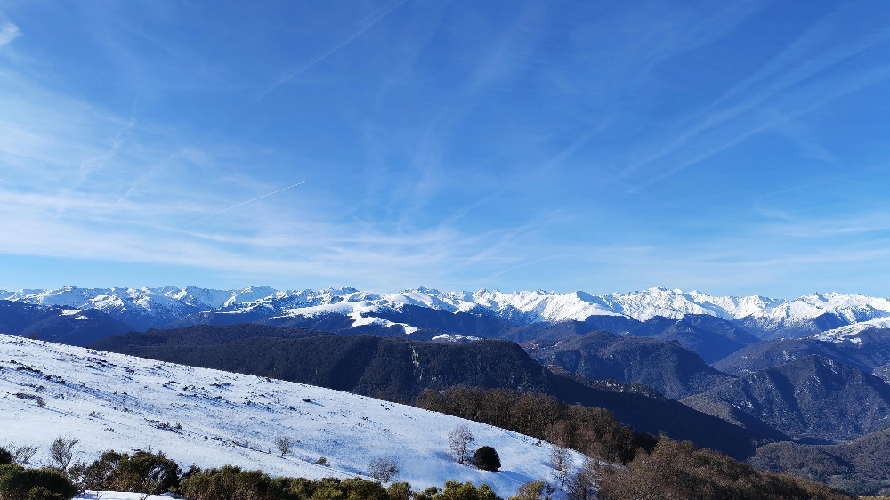 Résumé : une randonnée hivernale féerique, aux paysages verdoyants sur les plaines environnantes, cimes pyrénéennes qui avaient déposé leurs manteaux blancs.