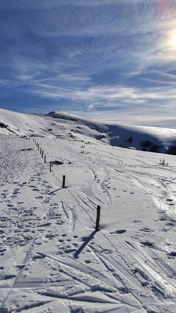 Il est autour de 9h, après une boisson chaude, nous empruntons un sentier creux (balisé traits jaunes, passage au col du Traucadou (1 255 m) qui coupe deux fois une piste, donc parfois un peu raide. Nous sortons de la forêt de Front Frède (agréable, troncs d’arbres couverts de mousse), la neige au sol nous oblige de chausser nos raquettes. Le manteau neigeux est « confortable », durci par une nuit froide et l’itinéraire bien marqué par les randonneurs devant nous…