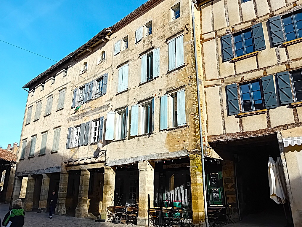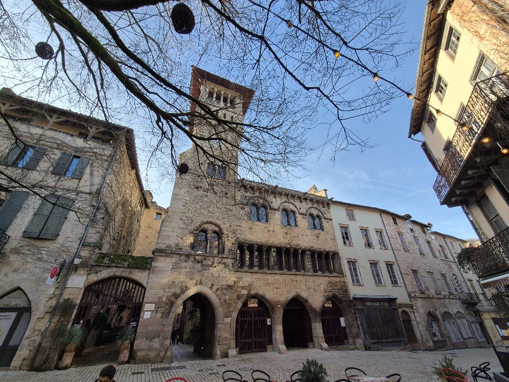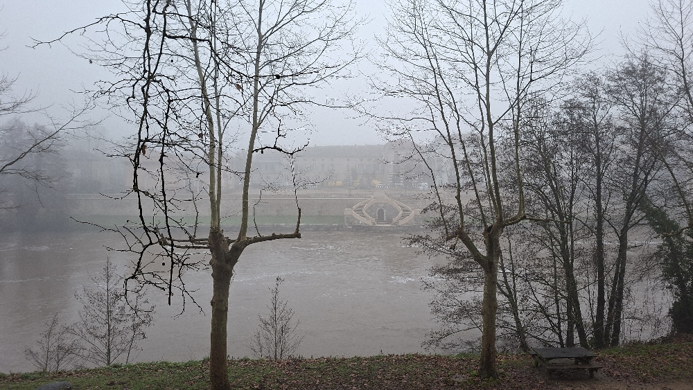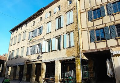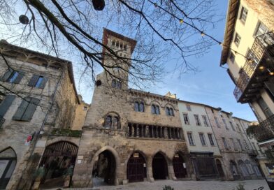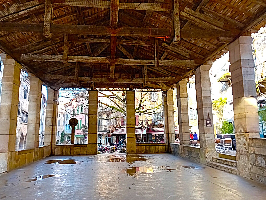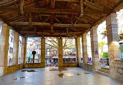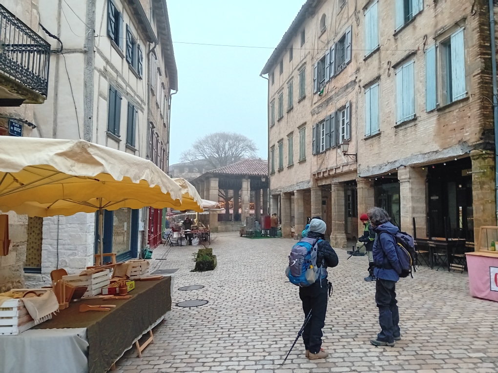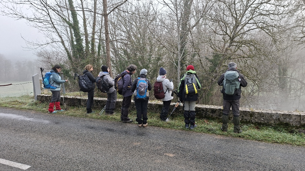 Un groupe de 9 randonneurs et randonneuses (défection d’un randonneur souffrant) – partis à 7h du rendez-vous habituel – était prêt dès 8h45 à affronter le brouillard de la vallée dans une ambiance proche de zéro degré. Après le franchissement du pont pour regagner le village médiéval, le groupe traverse le marché de plein-vent installé autour de la superbe halle de pierre et de bois, repère le café où il fera bon prendre le pot de l’amitié au retour de la boucle de marche, cet après-midi.