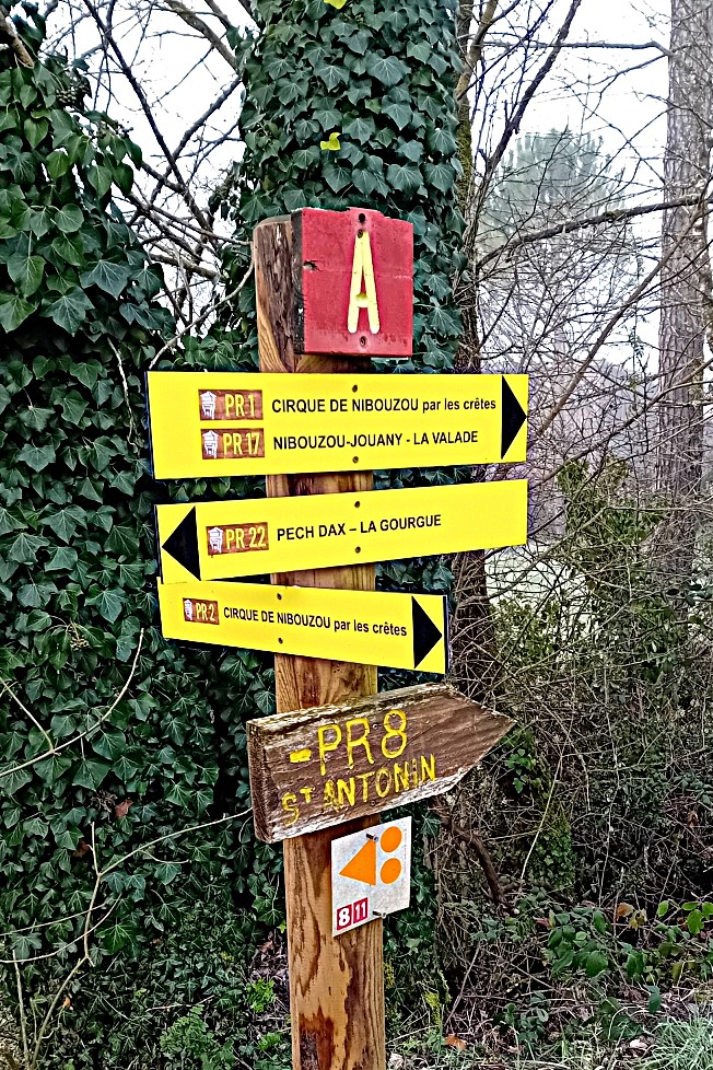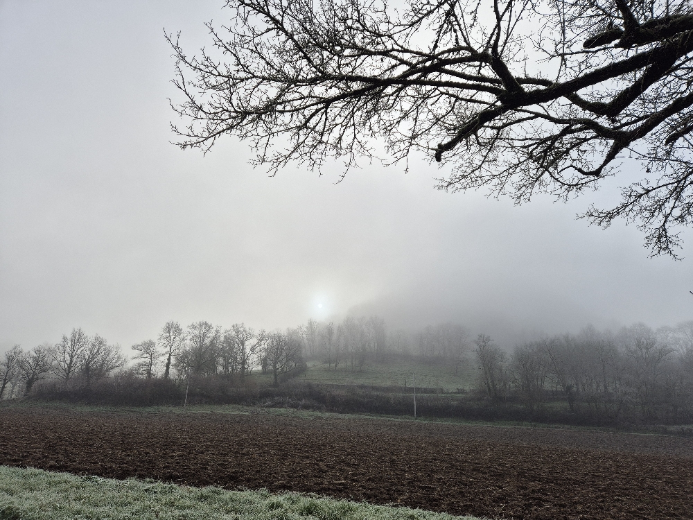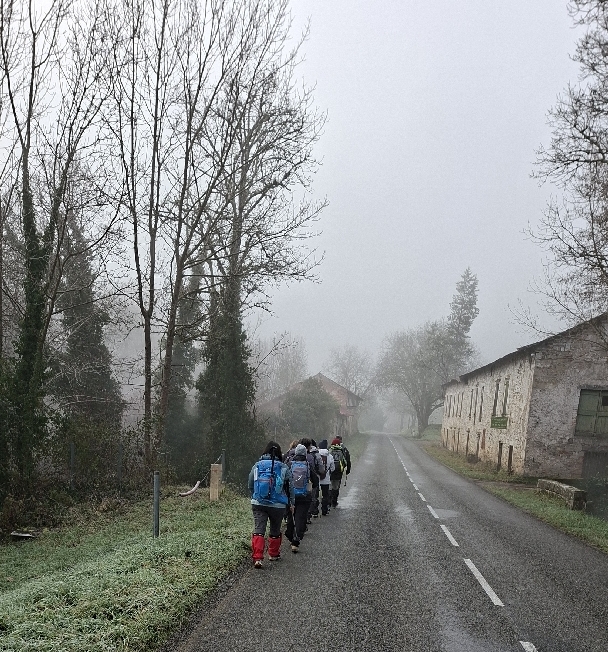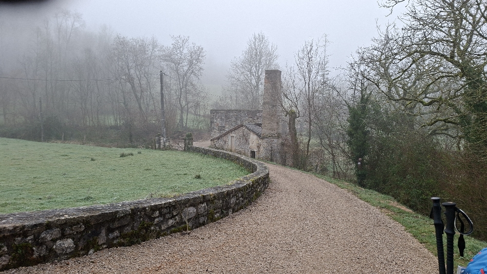 Le sentier du Santou nous mène le long de la vallée de la Bonette (affluent de l’Aveyron), mais pour l’instant pas question d’admirer le panorama depuis le hameau de Maillolong, notamment les superbes falaises que l’animateur avait promis, totalement masquées par le brouillard épais. L’humidité et le froid pénétrant nous incitent à marcher sans relâche. D’anciennes manufactures abandonnées : cartonnerie, ferronnerie, etc… rappellent que la cité de Saint-Antonin a été très active.