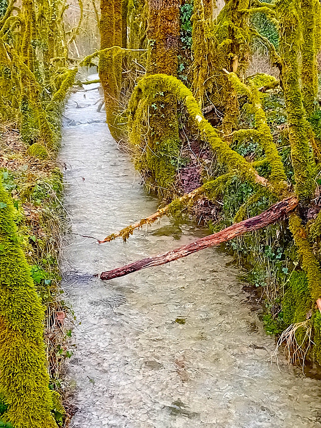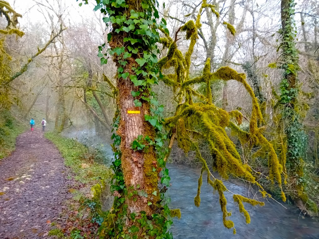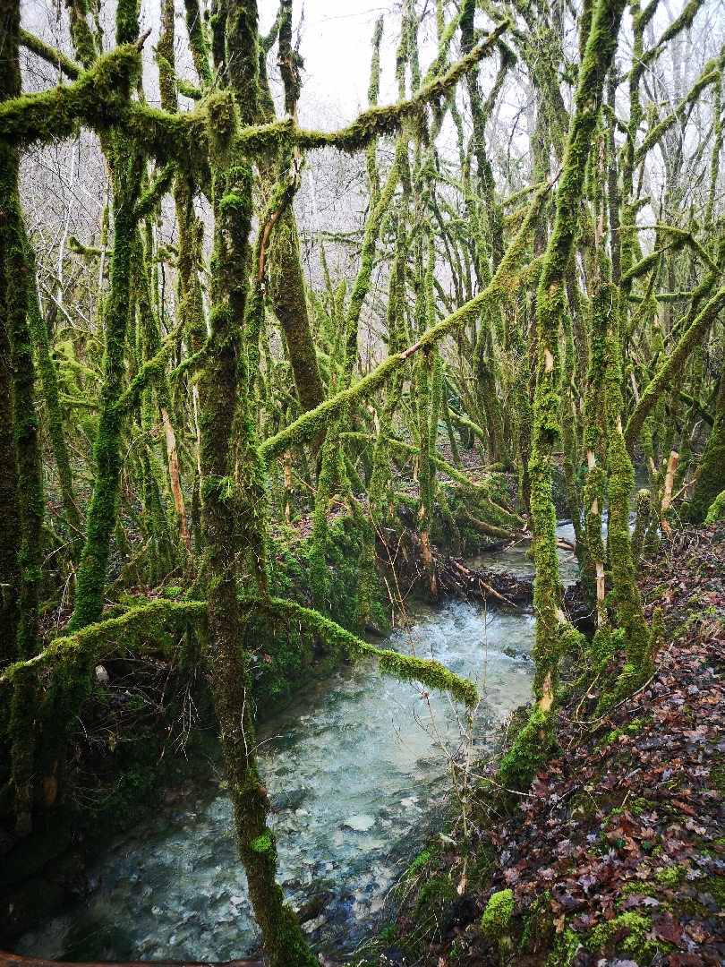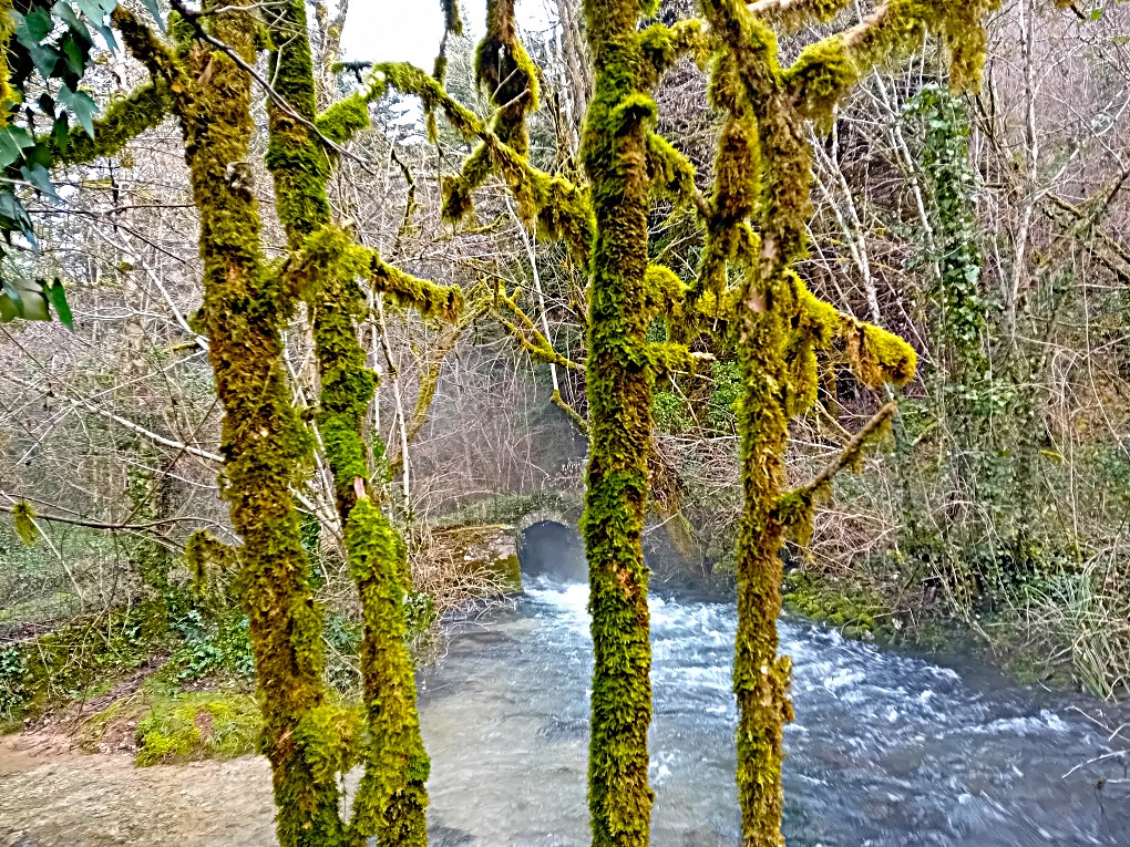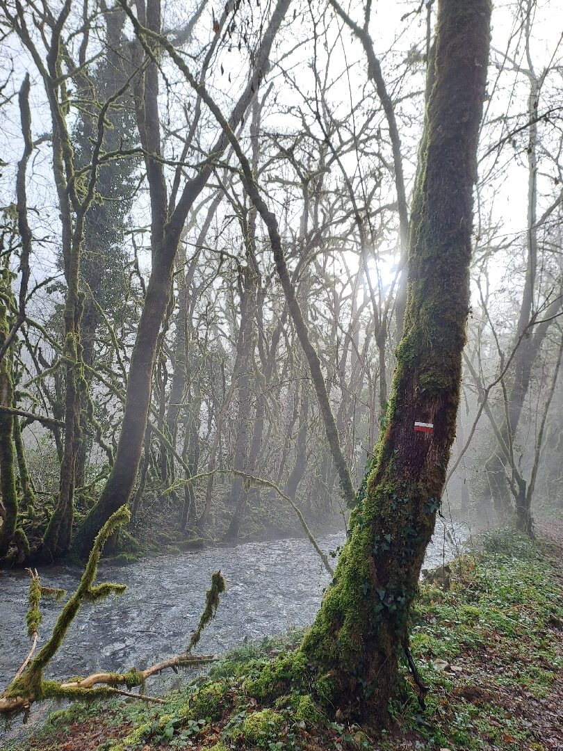 En suivant la rive droite du cours d’eau, le PR 8 nous mène à la rencontre du GR 46 en direction de la résurgence de la Gourgue (du latin « Gorga » = gouffre, tourbillon d’eau, abîme…) Au niveau d’une barrière, une bifurcation du sentier nous mène à la résurgence qui alimente en partie en eau potable les habitants de Saint-Antonin. L’ambiance est mystérieuse, embrumée, les arbres tortueux sont recouverts de mousse, l’eau est fumante et se mêle aux brumes du matin, les grottes se succèdent… sommes-nous arrivés dans les Terres du milieu, trouverons-nous le Seigneur des Anneaux aux confins de la grotte ?