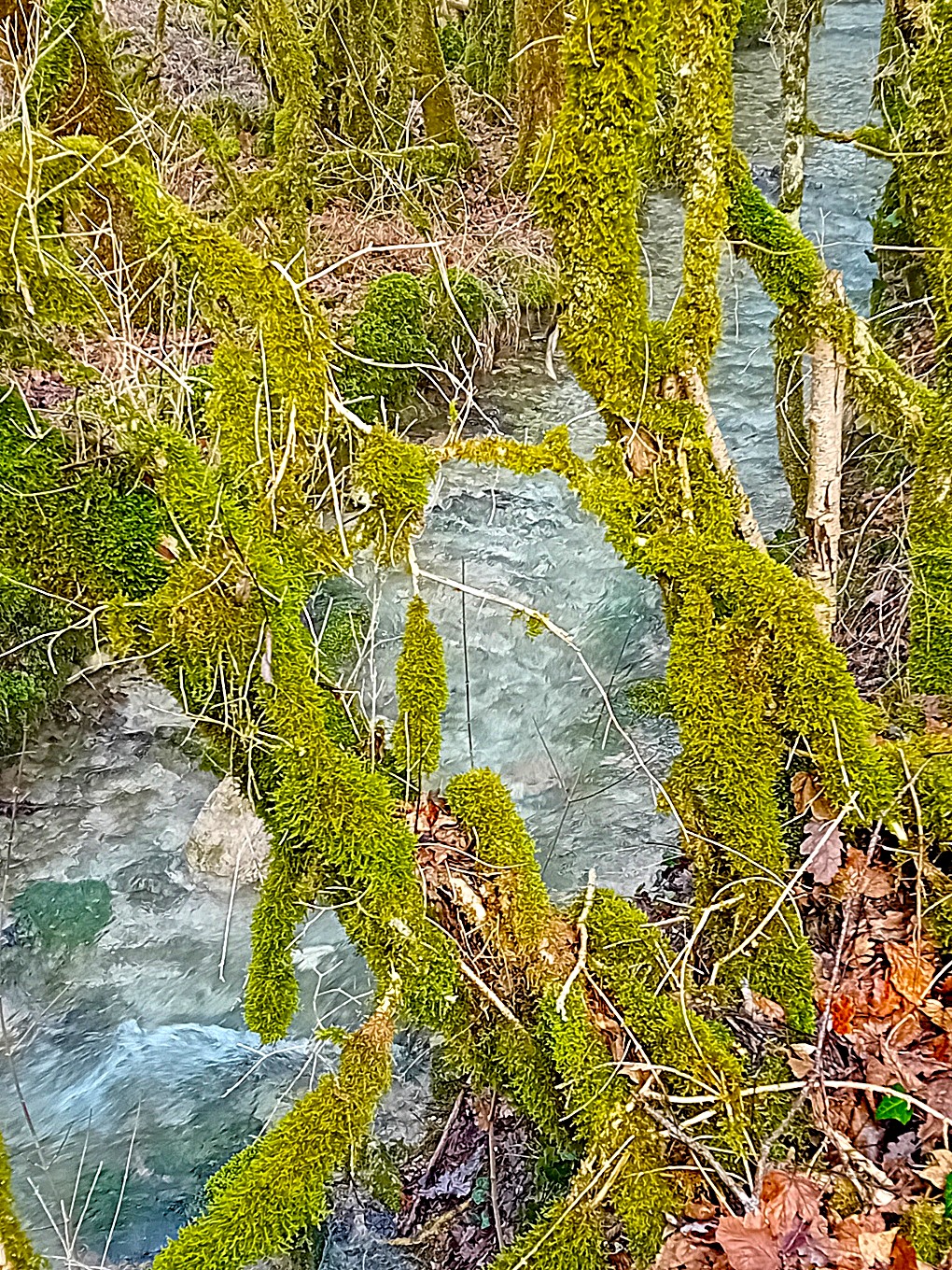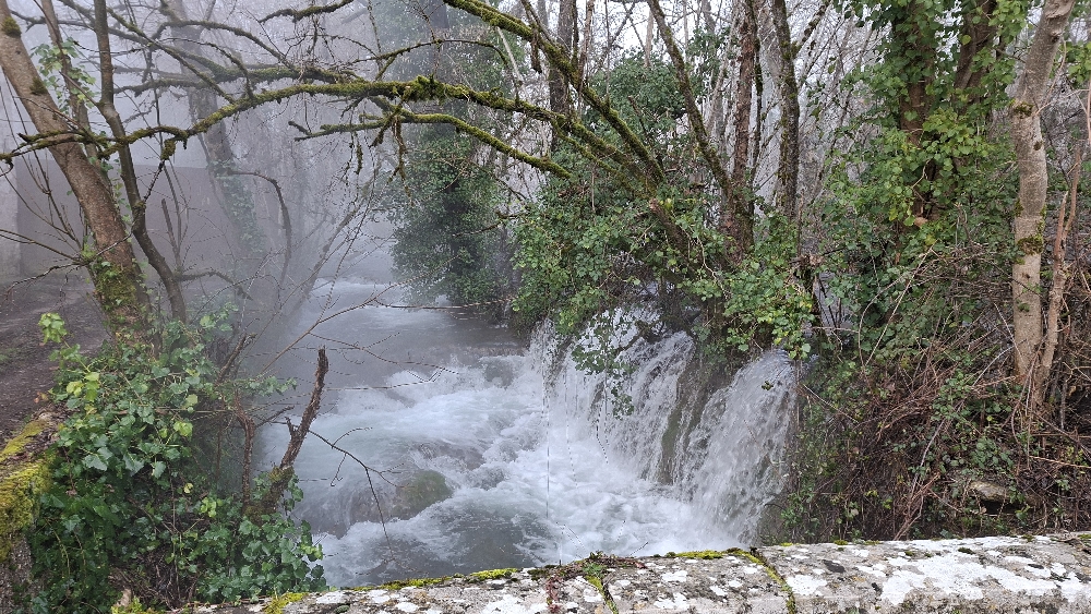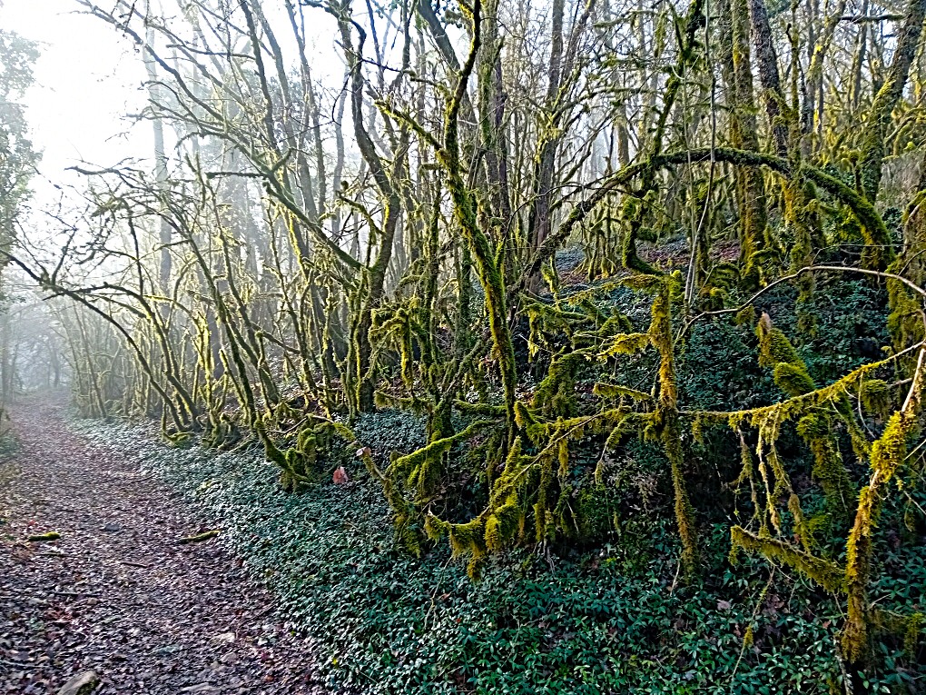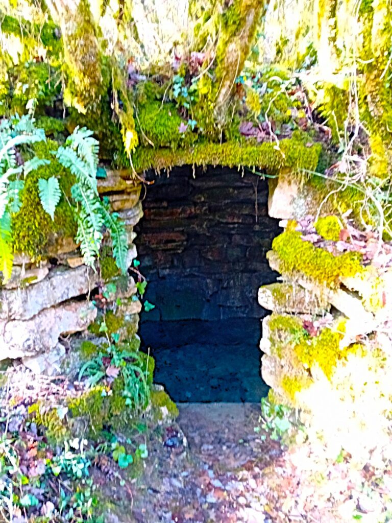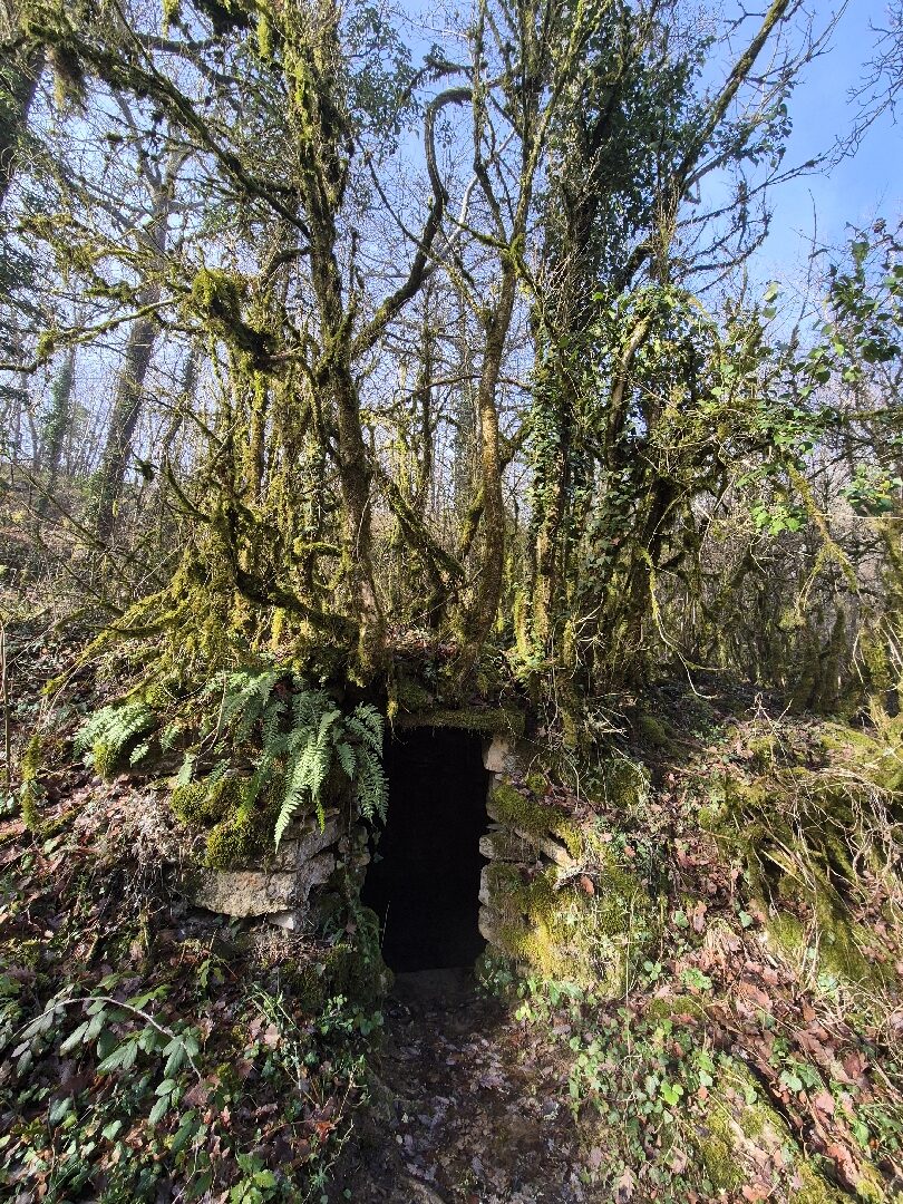 En suivant la rive droite du cours d’eau, le PR 8 nous mène à la rencontre du GR 46 en direction de la résurgence de la Gourgue (du latin « Gorga » = gouffre, tourbillon d’eau, abîme…) Au niveau d’une barrière, une bifurcation du sentier nous mène à la résurgence qui alimente en partie en eau potable les habitants de Saint-Antonin. L’ambiance est mystérieuse, embrumée, les arbres tortueux sont recouverts de mousse, l’eau est fumante et se mêle aux brumes du matin, les grottes se succèdent… sommes-nous arrivés dans les Terres du milieu, trouverons-nous le Seigneur des Anneaux aux confins de la grotte ?