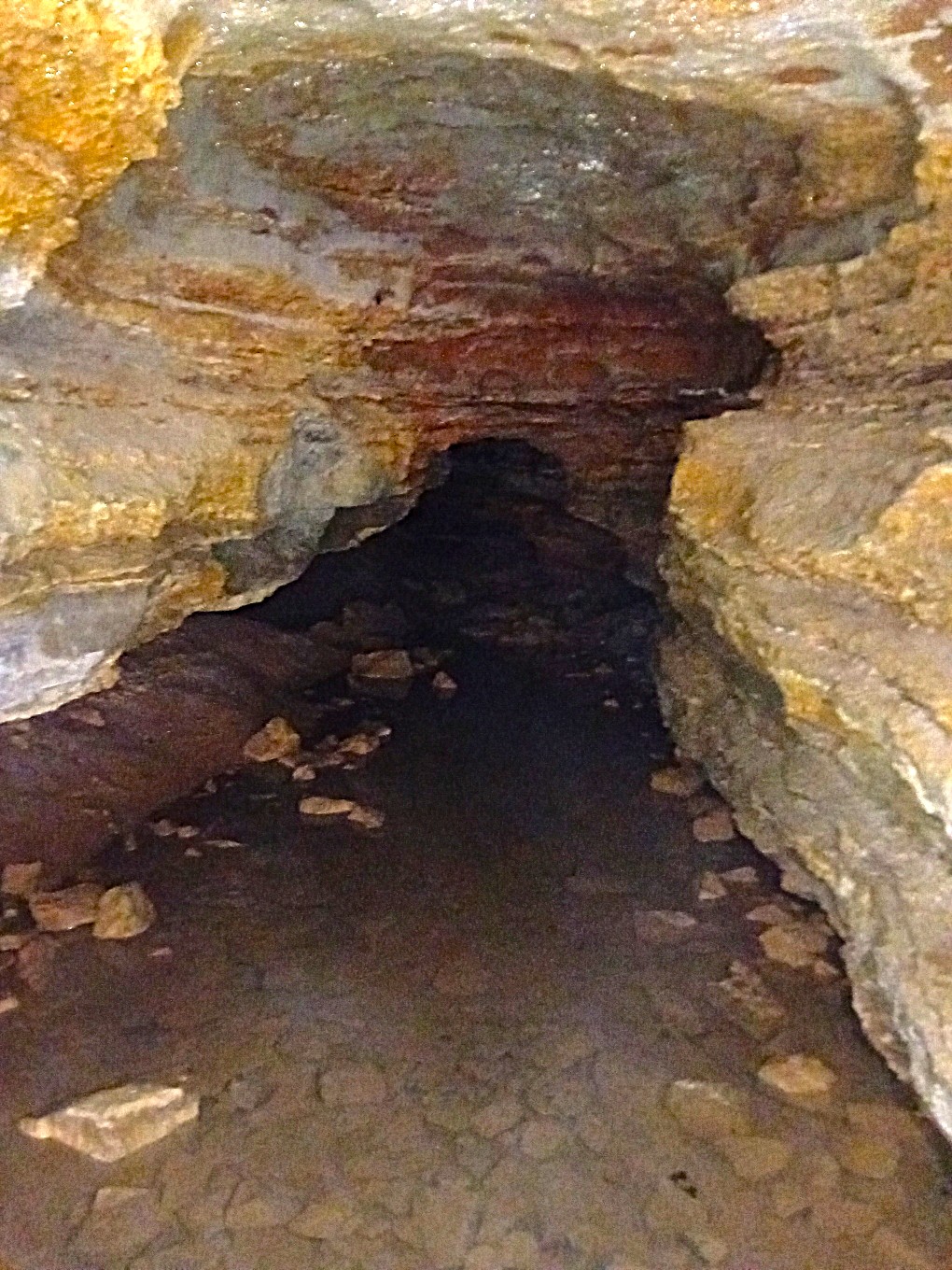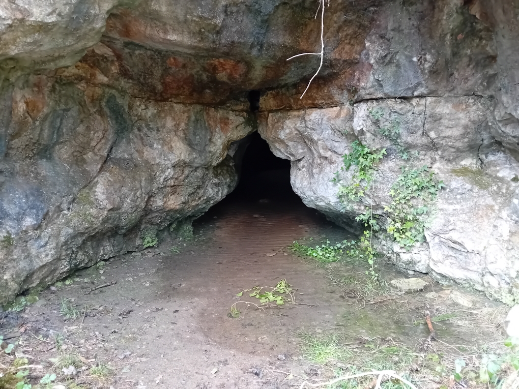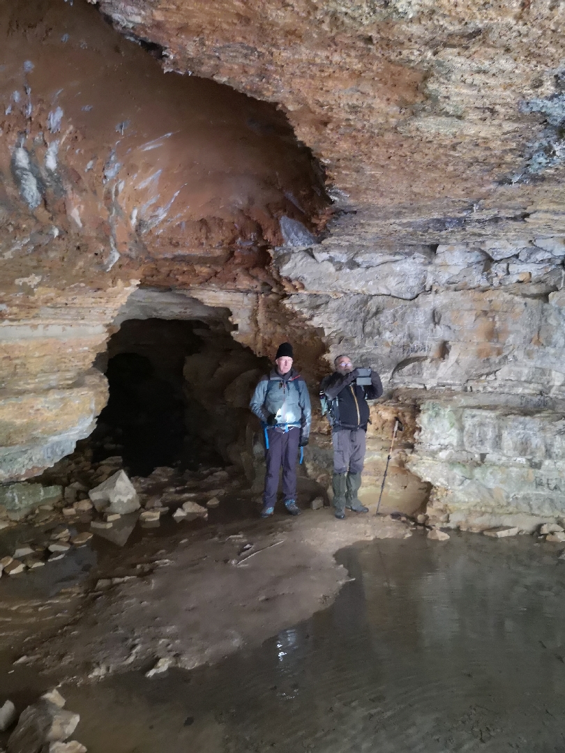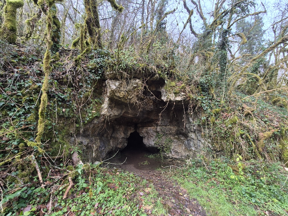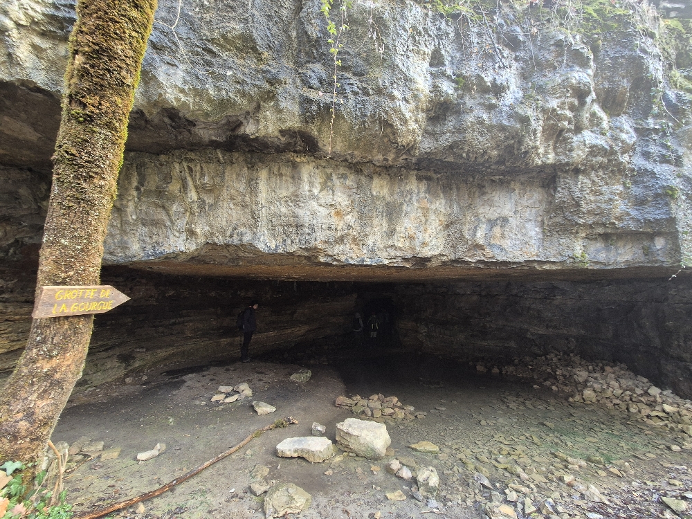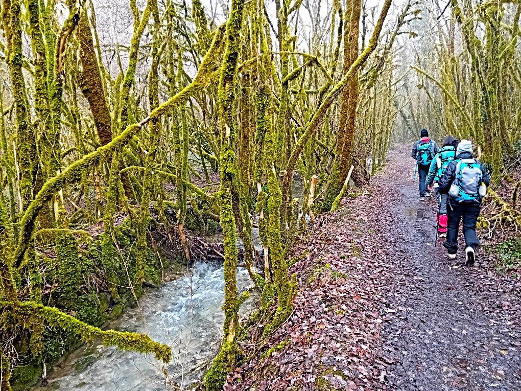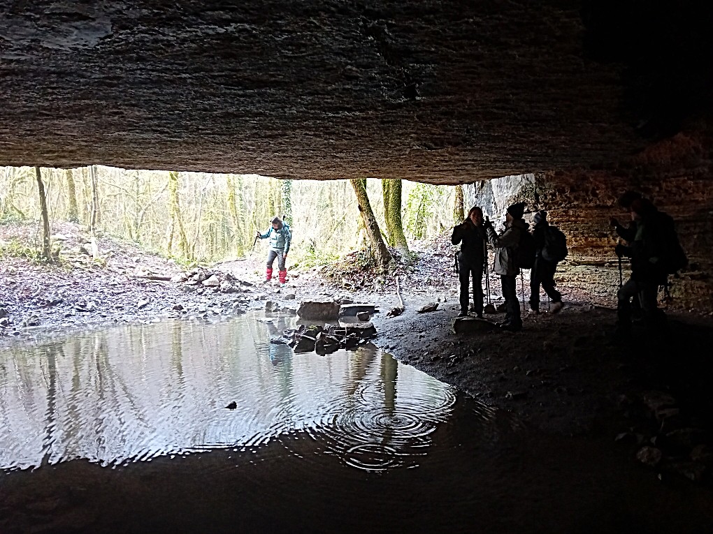 Si l’Aveyron était boueuse, l’eau de la Gourgue en aval est d’une clarté parfaite presque intrigante. Séduits par cette atmosphère irréelle, nous cheminons ensuite le long du ruisseau transparent situé en amont de la résurgence, le sentier l’enjambe, puis nous le quittons pour faire quelques dizaines de mètres jusqu’à une grotte dont l’ouverture est béante sous une dalle de calcaire. L’endroit est encore magique… nous posons pour la photo de groupe. Nous rebroussons chemin jusqu’à la barrière et reprenons l’itinéraire de la boucle pédestre du PR8.