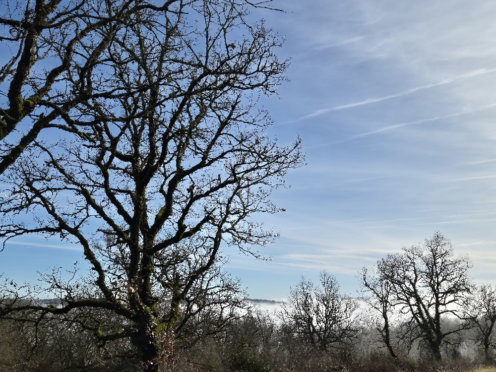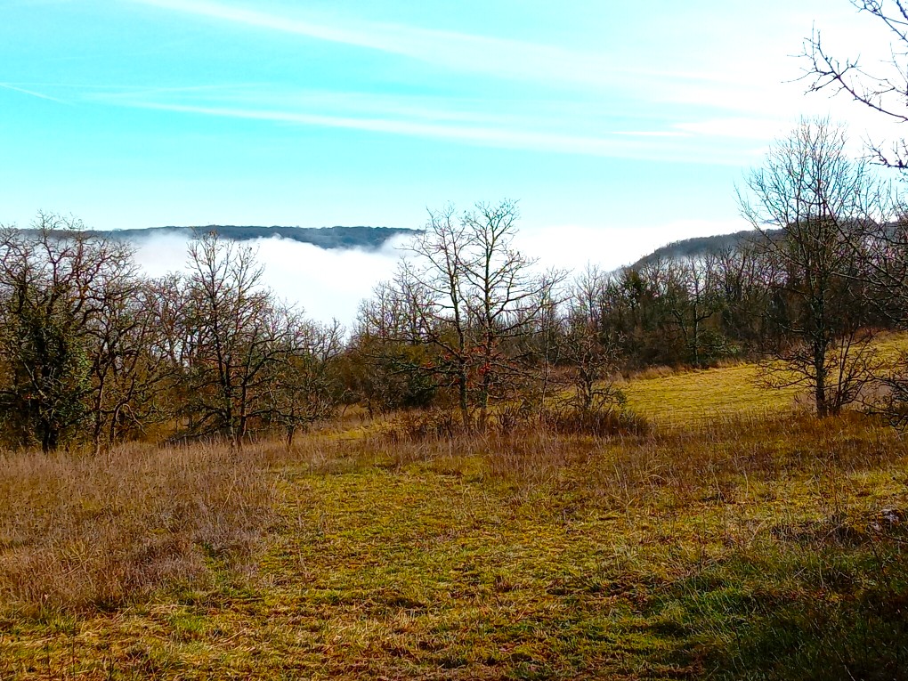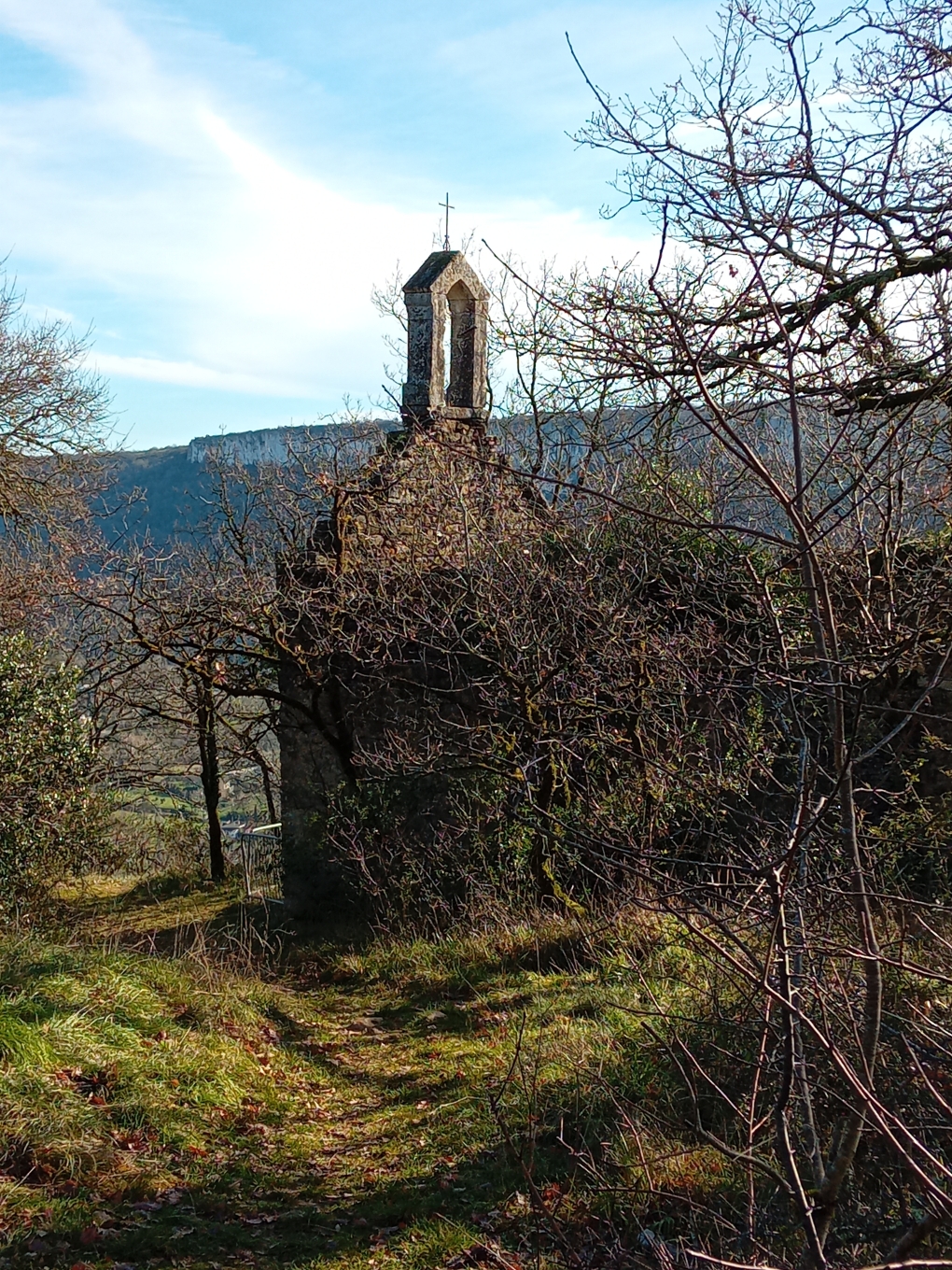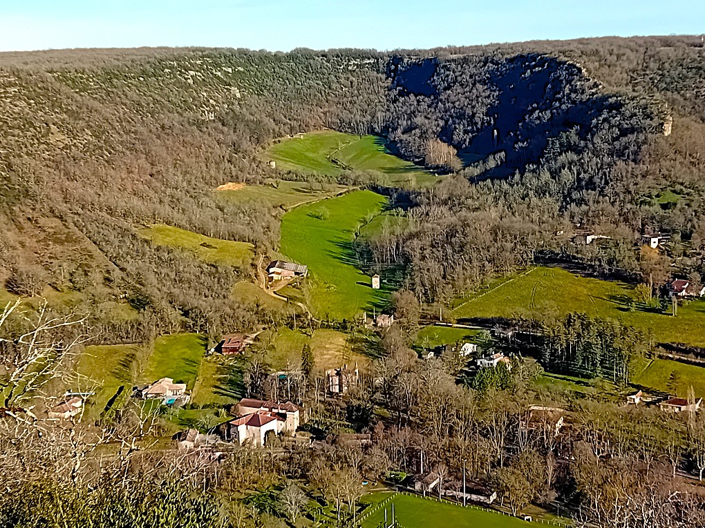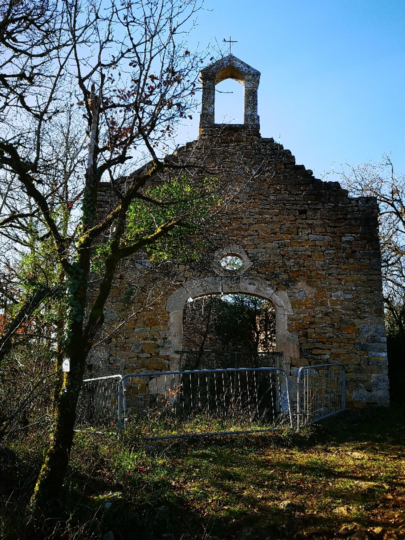 Quand nous repartons, le ciel est complètement dégagé presque bleu et nous découvrons un paysage spectaculaire. Au Pech Dax (altitude 313 m) nous contournons une ferme à l’architecture typique : habitation ornementée d’un « baylet » (escalier d’entrée amenant à une terrasse couverte avec colonnade, grange et pigeonnier imposants) avant d’arriver à la chapelle en ruine, point sublime et dernière étape du chemin du Calvaire qui débute à Saint-Antonin au fond de la vallée.