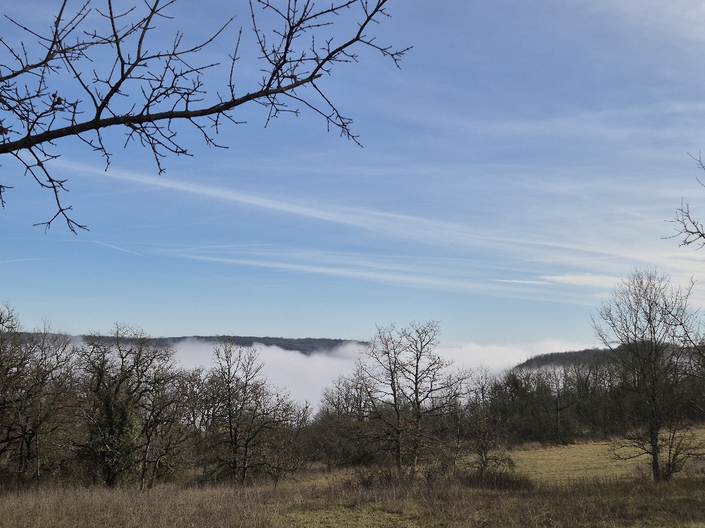Le point de vue à sur les falaises blanches des gorges de l’Aveyron, le roc d’Anglar à son sommet, la vallée de la Bonette et le village en contrebas est une belle récompense après quelques heures de marche dans le brouillard !