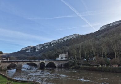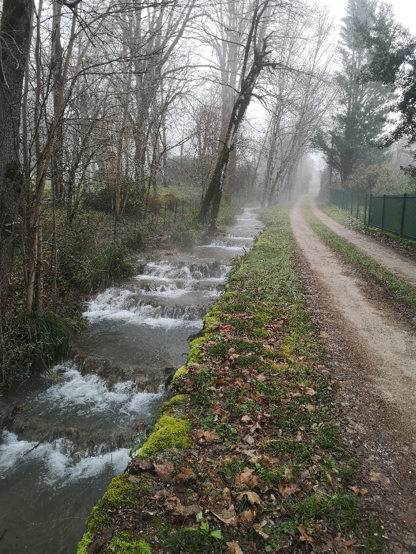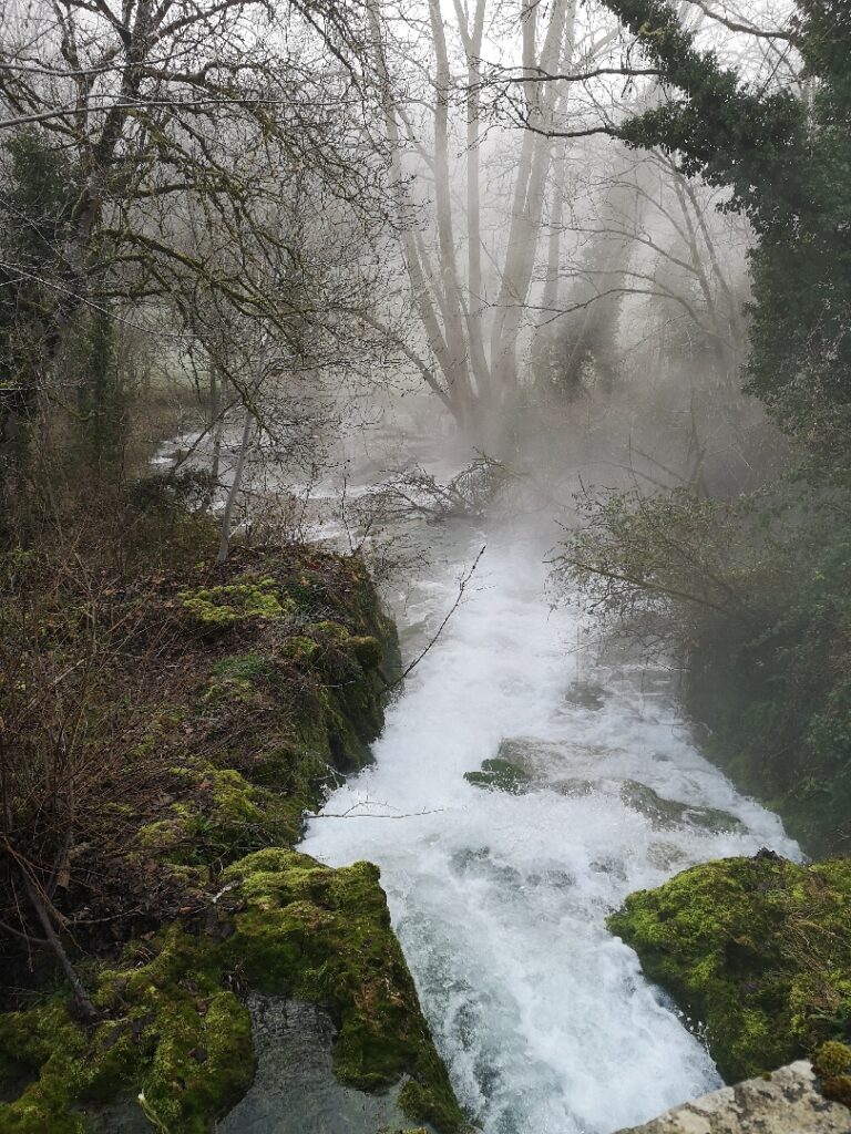 La résurgence et le débit d’eau qui sort de la terre sont impressionnants après la période de pluie de ce début d’hiver. La résurgence fait une dizaine de mètres de diamètre et forme une nappe circulaire qui paraît très profonde, il est interdit de se baigner dans cette zone de captage protégée par une clôture… mais l’idée ne nous est même pas venue à l’esprit en cette journée glaciale ! La géologie explique ce phénomène : les reliefs karstiques (où le calcaire se dissout sous l’action de l’eau) contiennent des réseaux d’eau souterrains qui affleurent parfois au pied des falaises le long des vallées ou des gorges. L’eau y ressort sous pression comme aujourd’hui après des pluies abondantes. Le ruisseau est parfois à sec en été.