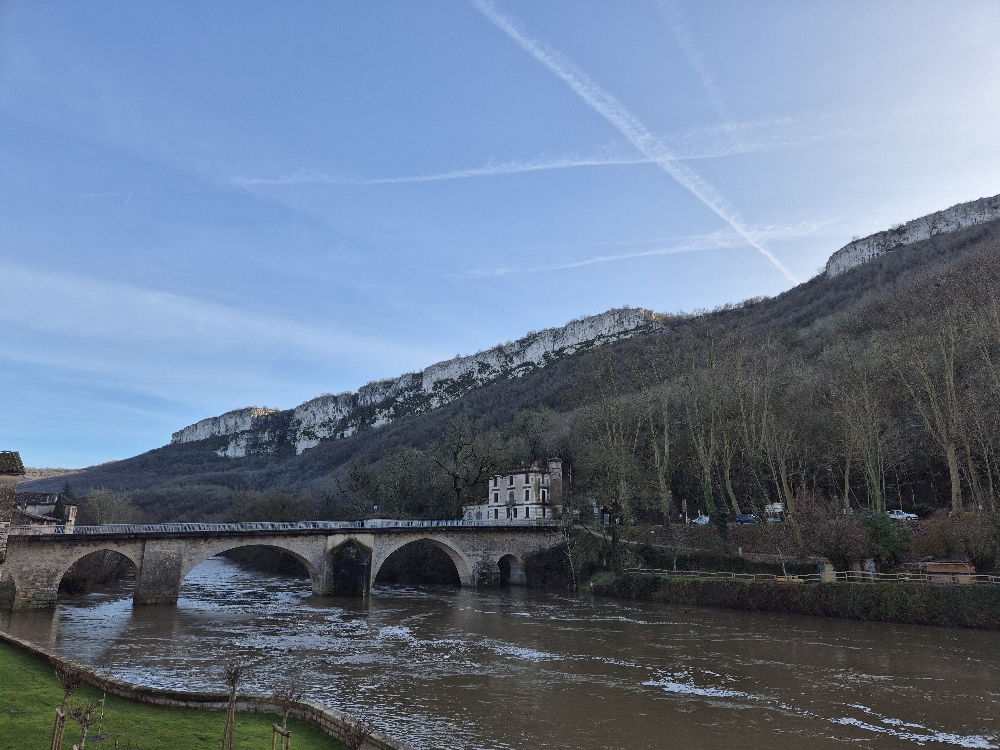 La descente est brutale et raide par un chemin en lacets jusqu’au village où nous arrivons vers 14h30 après 15 km de marche. Nous rejoignons les voitures garées sur la rive gauche de l’Aveyron pour se délester des sacs à dos et changer de chaussures avant de s’installer au chaud dans le sympathique bar de la place centrale du village où les boissons chaudes font l’unanimité pour ce pot de l’amitié. Merci pour les pâtisseries et les madeleines « maison » !
