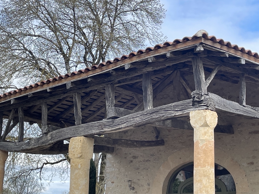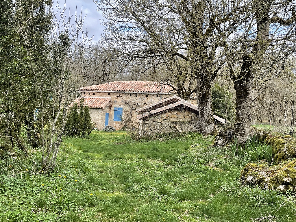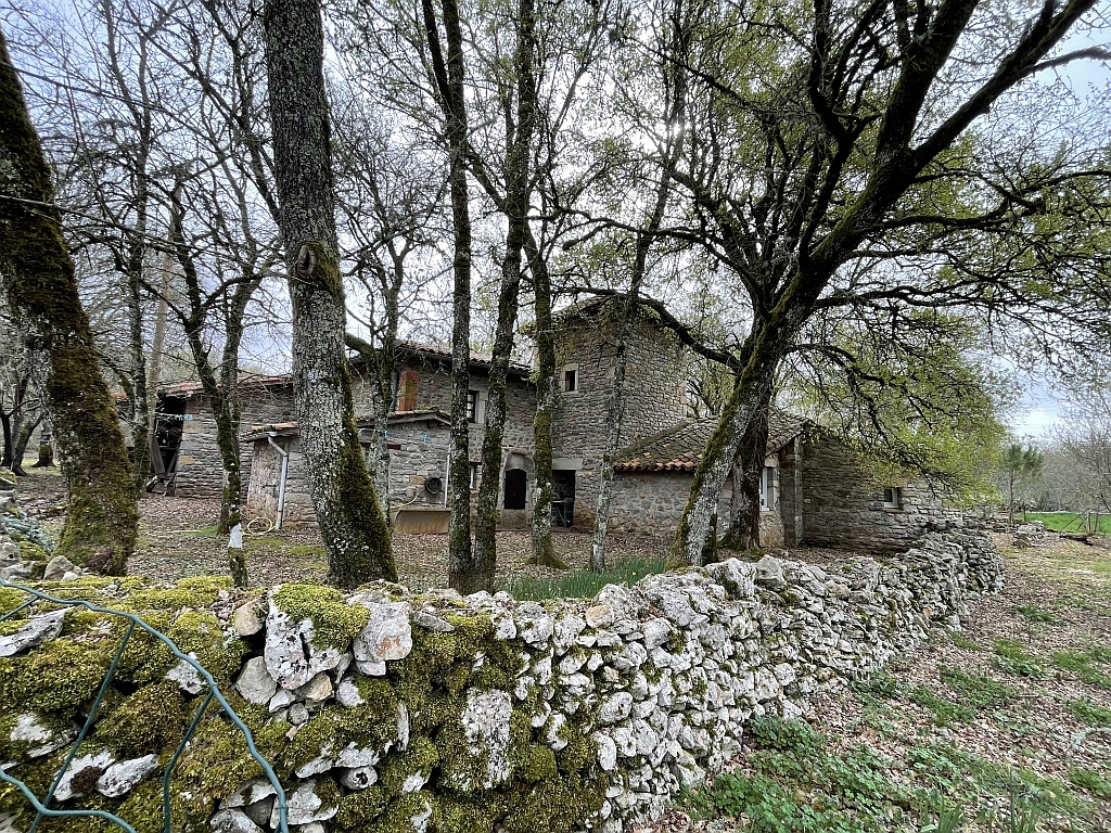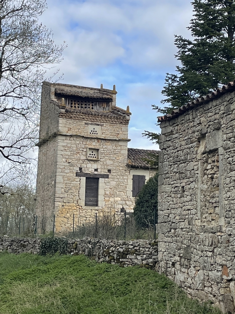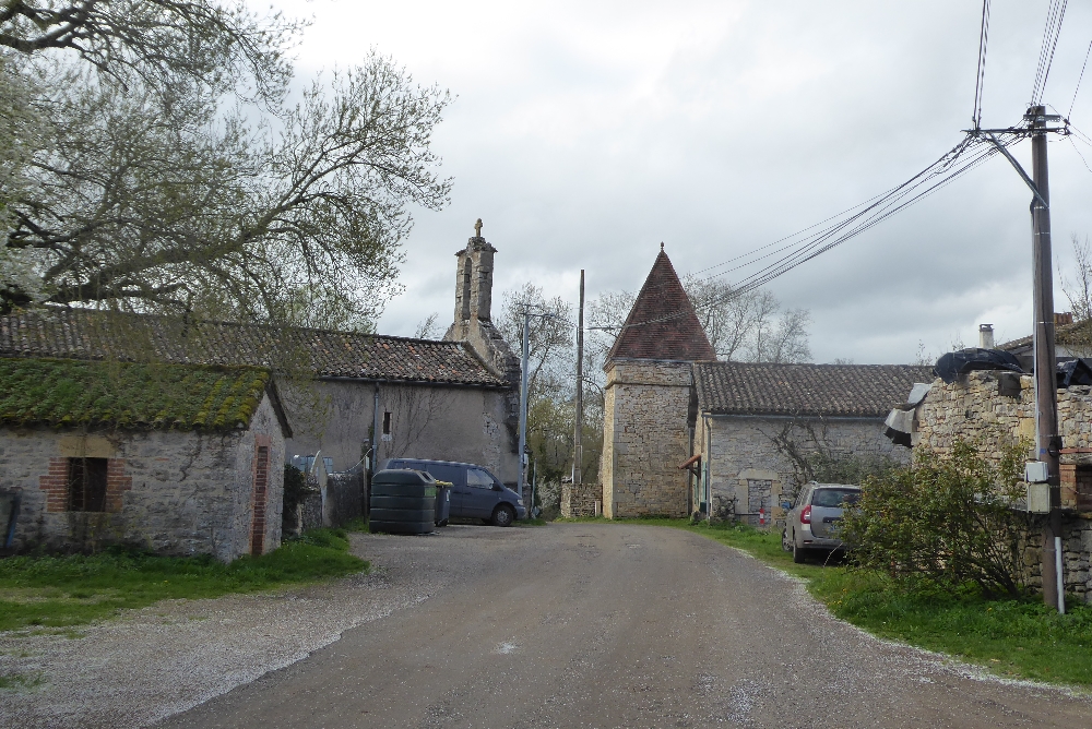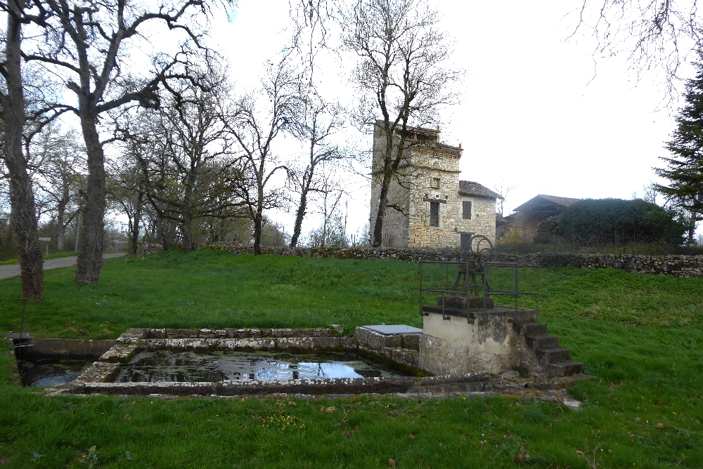 Après 2 km de route, on arrive au lieu-dit « Aliguières », on admire une maison de pierres et pigeonnier de grenier, une autre ferme, un pigeonnier pied de mulet et un lavoir avec une grande roue.