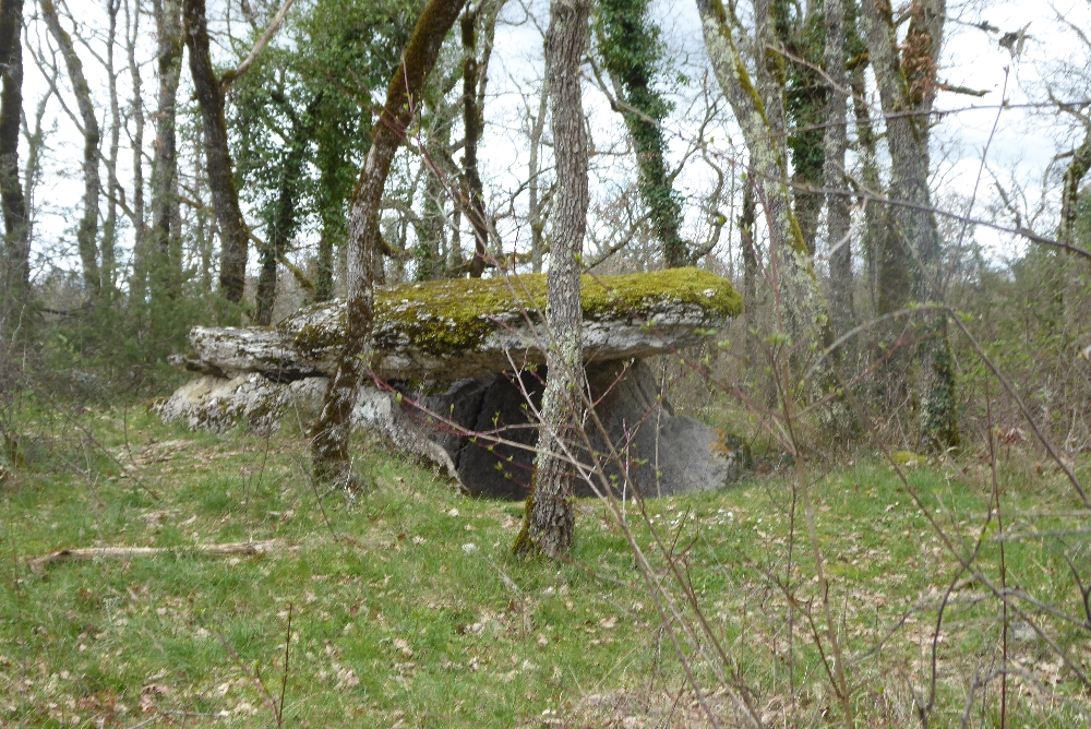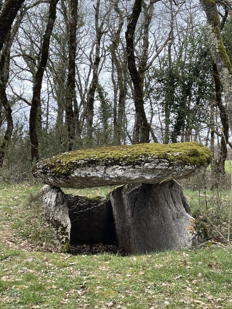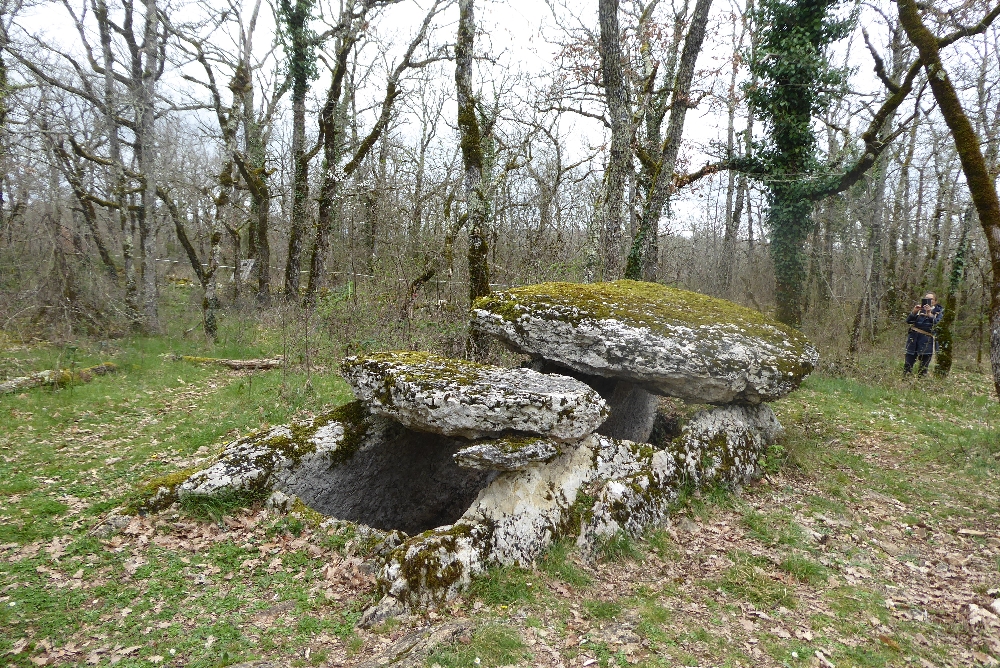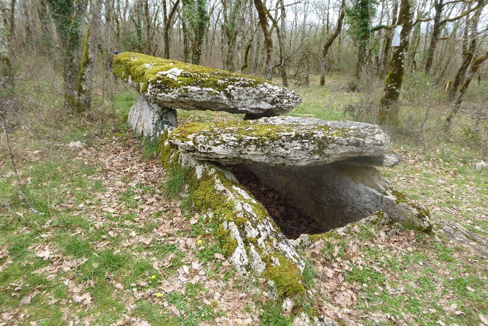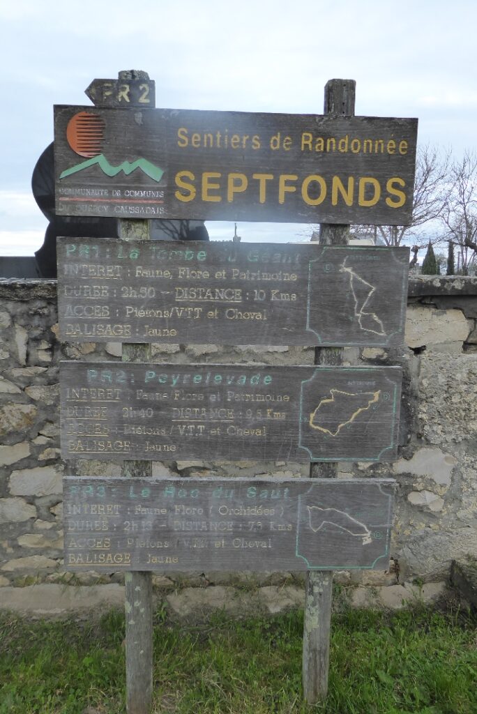 À une croisée de chemins, une affiche indiquant les 3 communes : Cayriech, Septfonds et Saint-Cirq. Puis enfin sur notre gauche, la magnifique Tombe du Géant, un immense dolmen, sépulture collective de 2 500 à 1 700 av. J.-C. assez impressionnant.