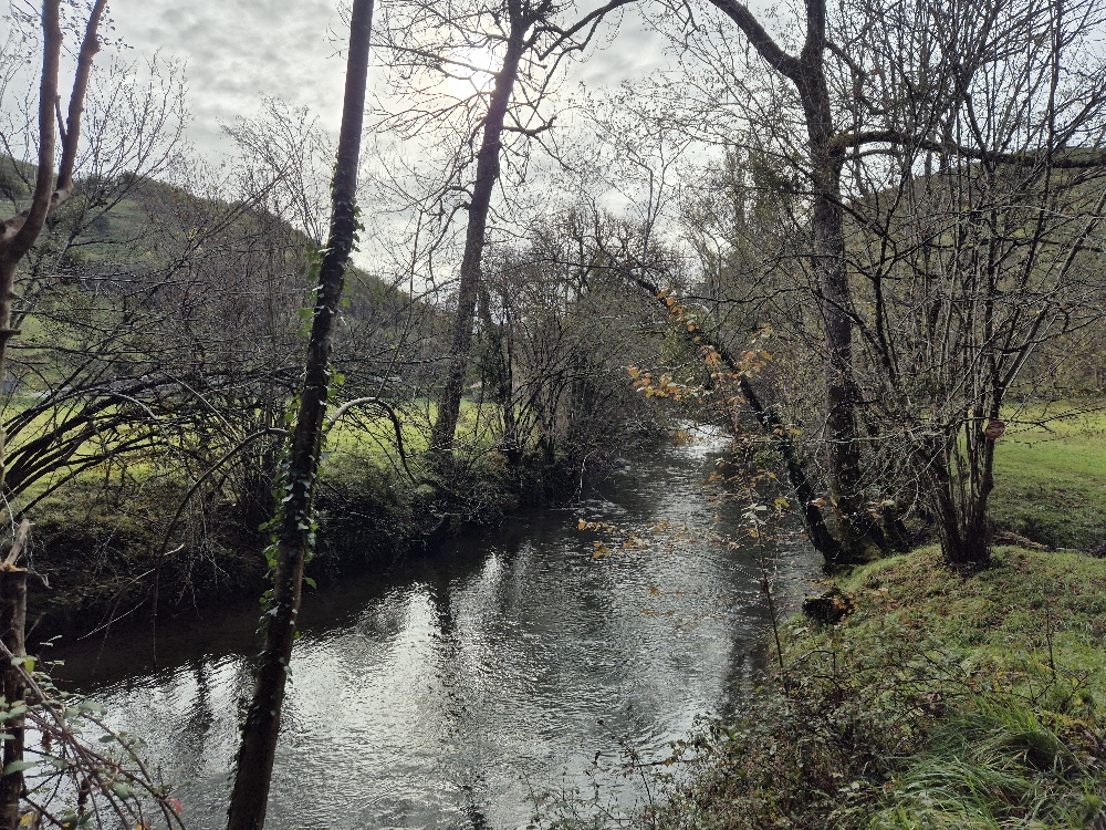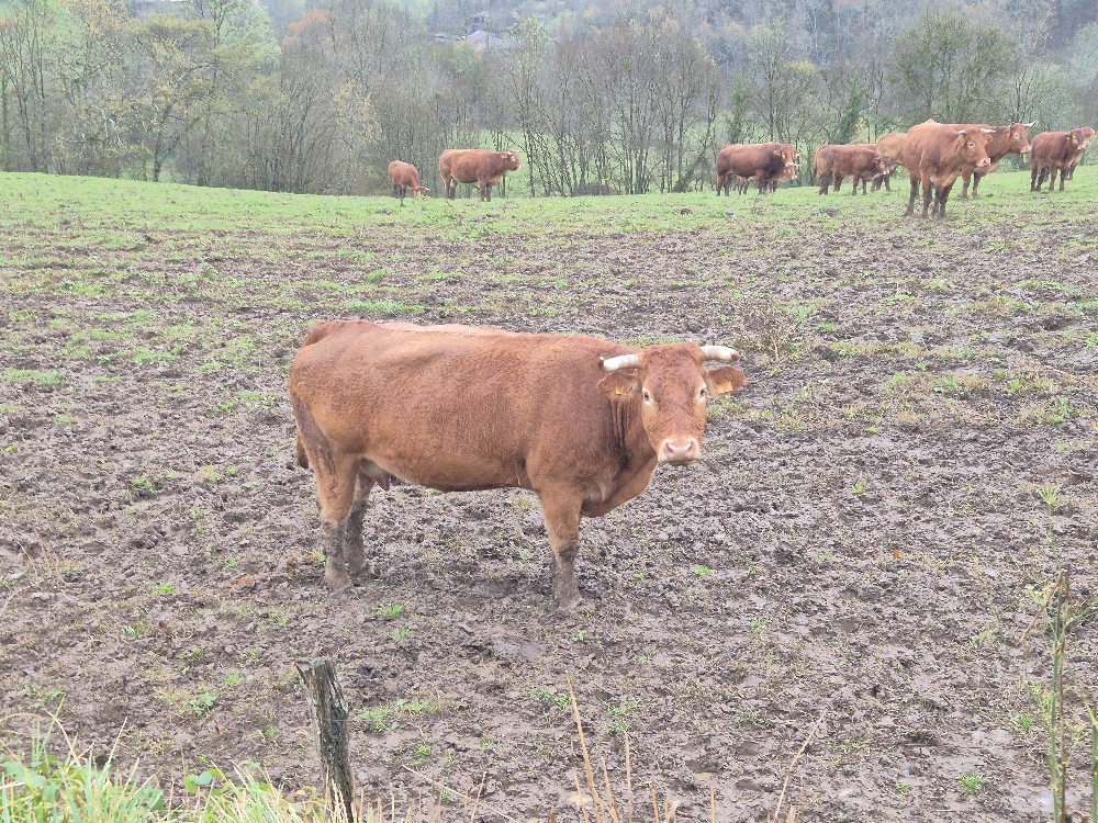 Nous descendons vers la vallée, traversons une belle prairie, empruntons la D15 pour traverser l’Arize, et en suivant le balisage pénétrons dans une prairie au-dessus de la route. Exactement ce qu’il ne faut pas faire par condition humide. Les multiples sentiers dessinés par les animaux sont étroits, boueux et glissants à flanc d’une forte pente. Heureusement, tout le monde est resté concentré et est passé sans encombre.