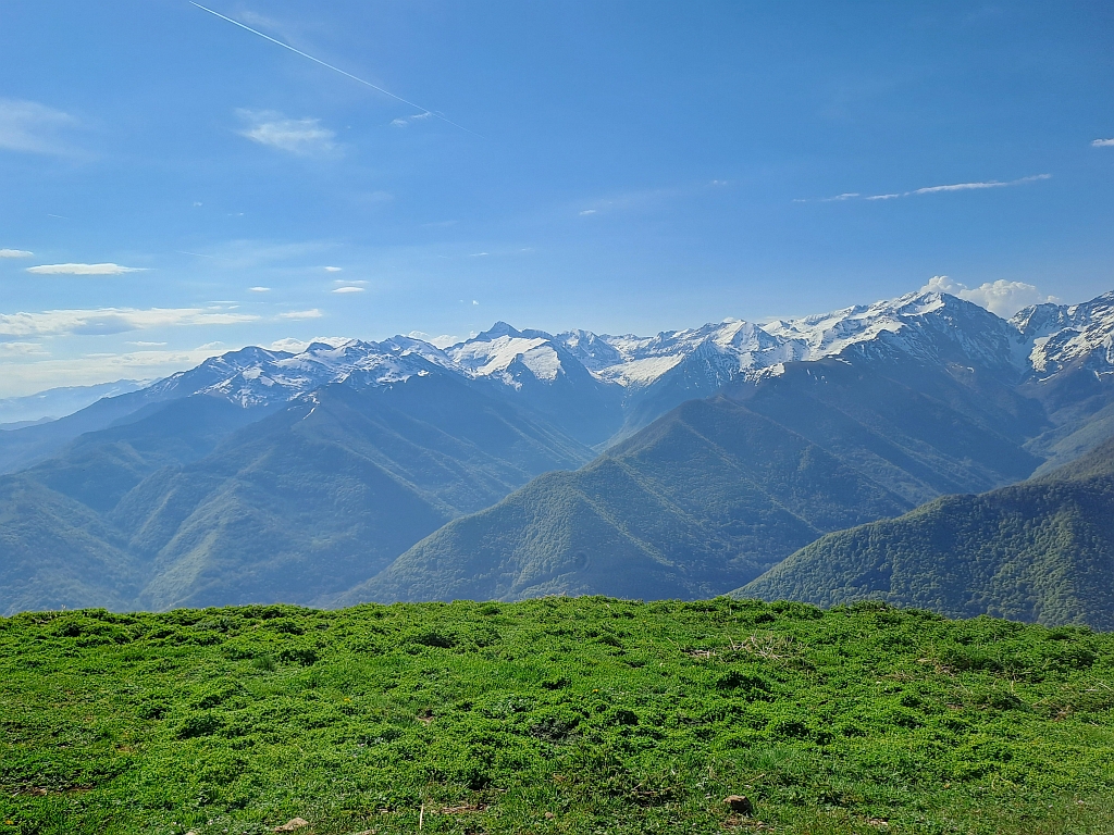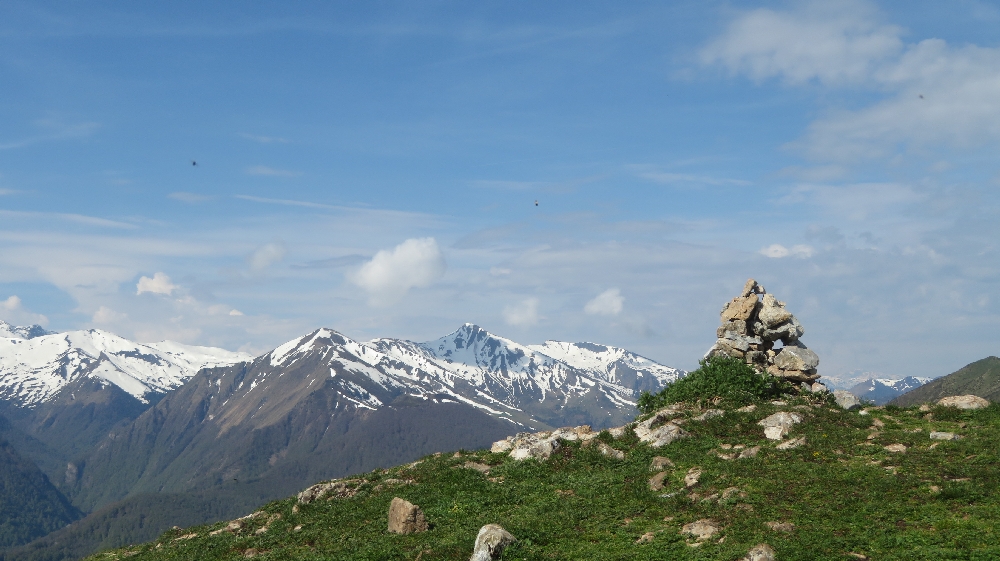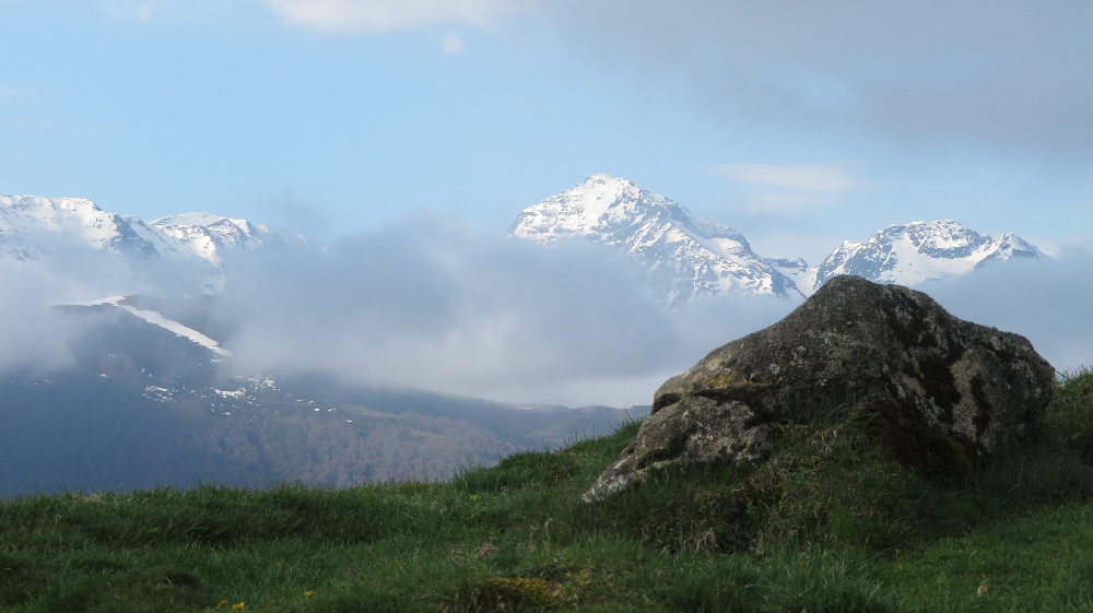 Une dernière montée et nous voilà au col de l’Arraing, le panorama est magnifique, face à nous, le Maubermé, la Mail du Bulard, le Valier qui accrochent à leur sommet quelques nuages.