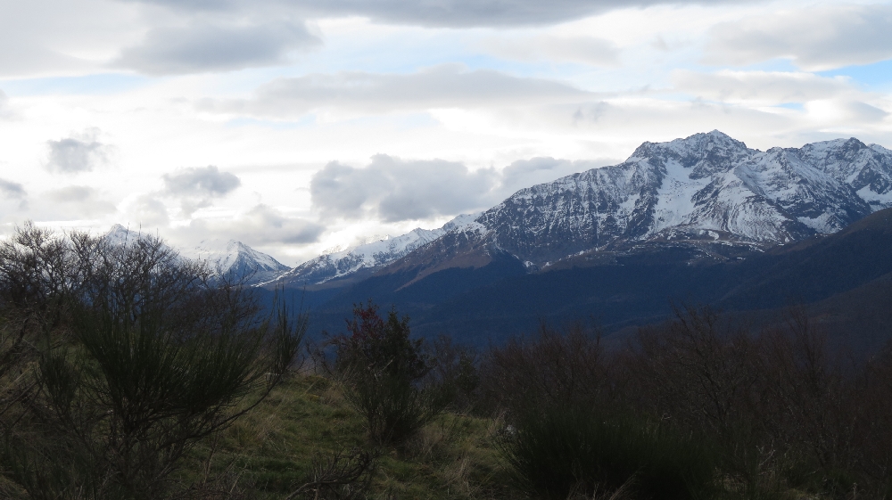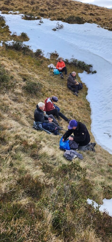 Un petit vent glacial nous accueille mais son panorama grandiose nous fait oublier le froid. À proximité, Daniel nous trouve une petite cuvette (et son petit névé) pour prendre notre repas, il est midi, trois vautours nous surveillent d’en haut… (la vue, 360°, du sommet, sur les pics du Midi, Arbizon, Aret, au loin, Maubermé, Mont Valier et tous les autres, également sur la plaine…) Le soleil, un peu timide par moment, nous réchauffe.