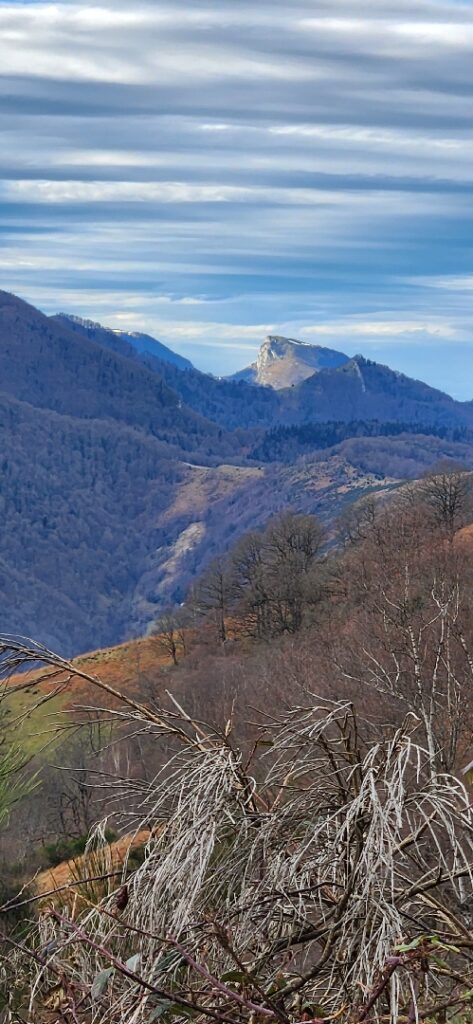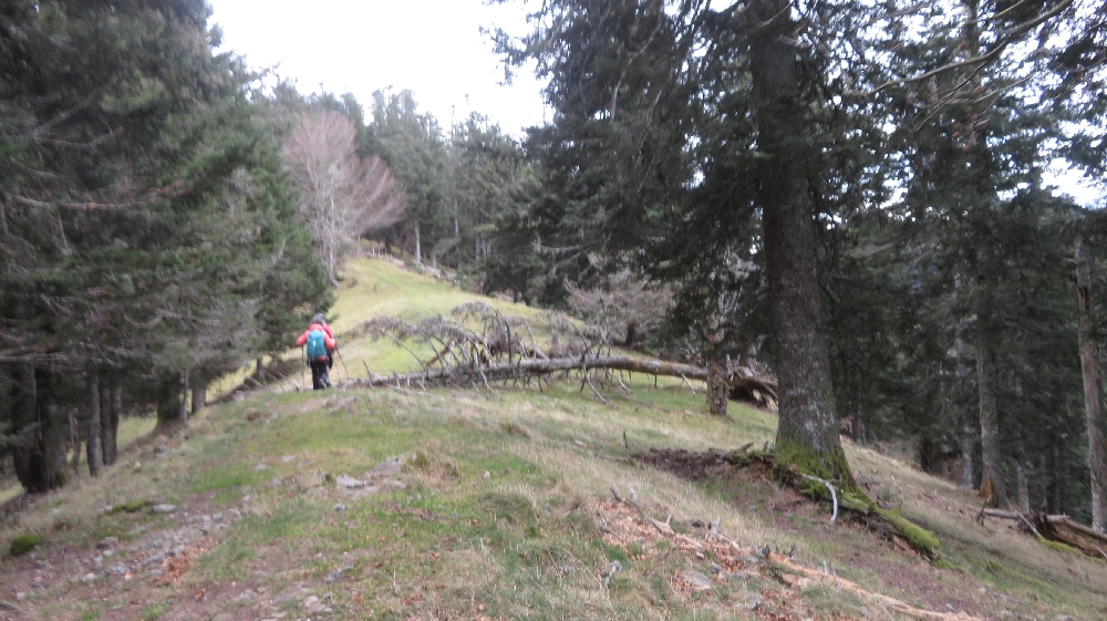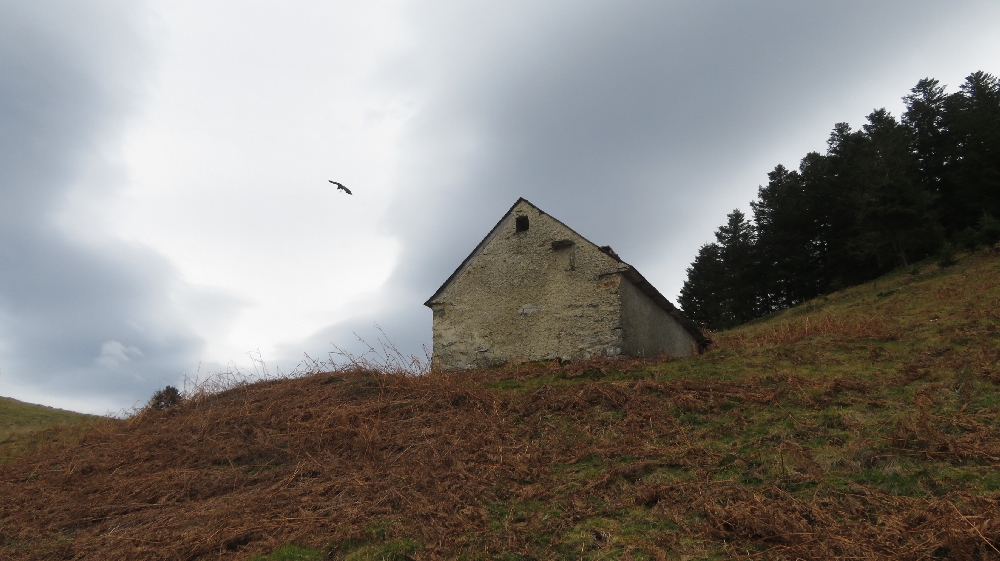 Il est 9h30, après les boissons chaudes (5°C), quand nous empruntons ce petit chemin (redressé) de la crête. Nous traversons deux fois la piste, nous sortons du bois (toujours sur notre crête, points de vue), et maintenant, sous un panorama magnifique, nous arrivons aux deux cabanes de Collantigue (1440 m). La première (ancienne) est sommaire (mais propose une cheminée et deux bas flancs). La seconde, privée (pastorale réservée), est magnifique.