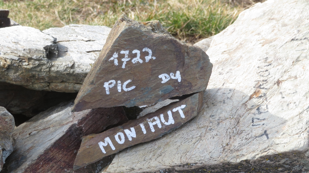 Pause ensoleillée, puis, toujours sur notre crête (un peu soutenue), nous faisons l’ascension du pic de Montaut, un cairn et une inscription nous prouvent bien que nous sommes au sommet (1722 m).