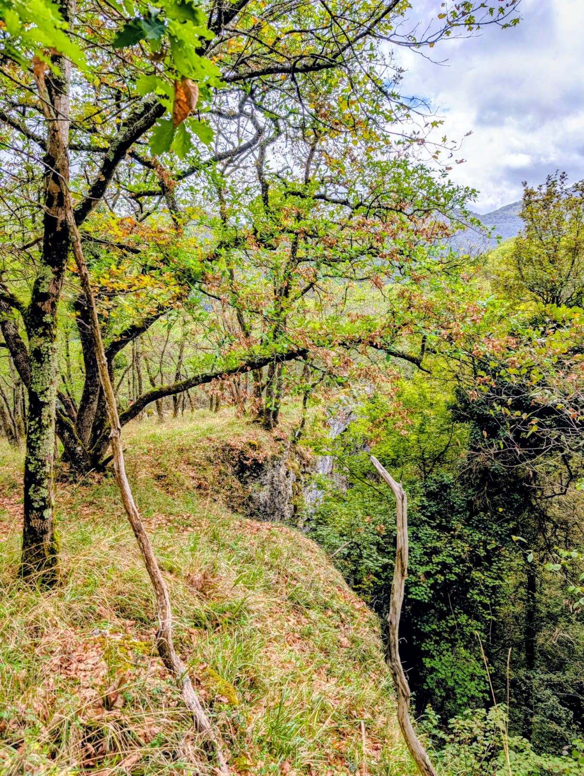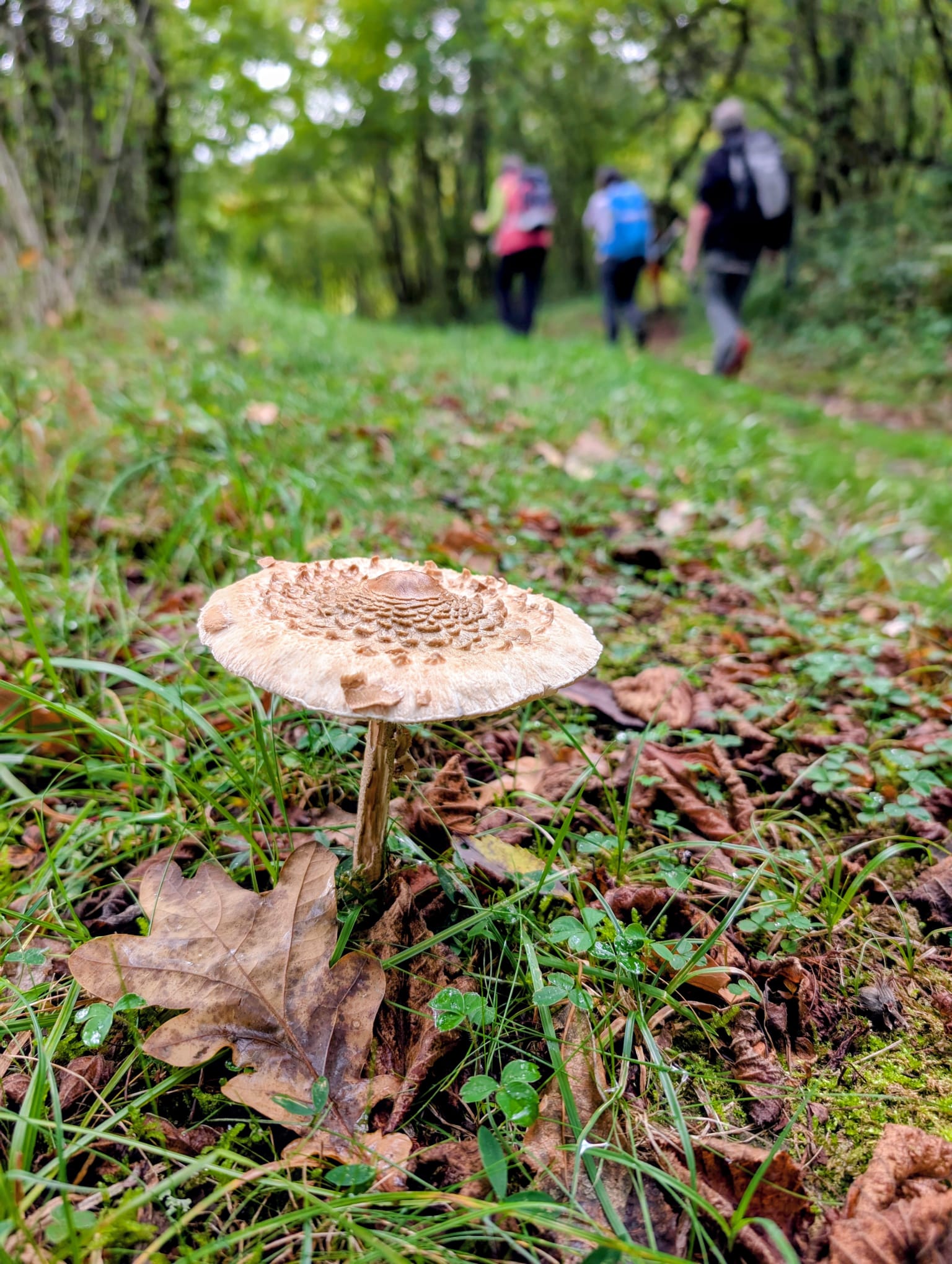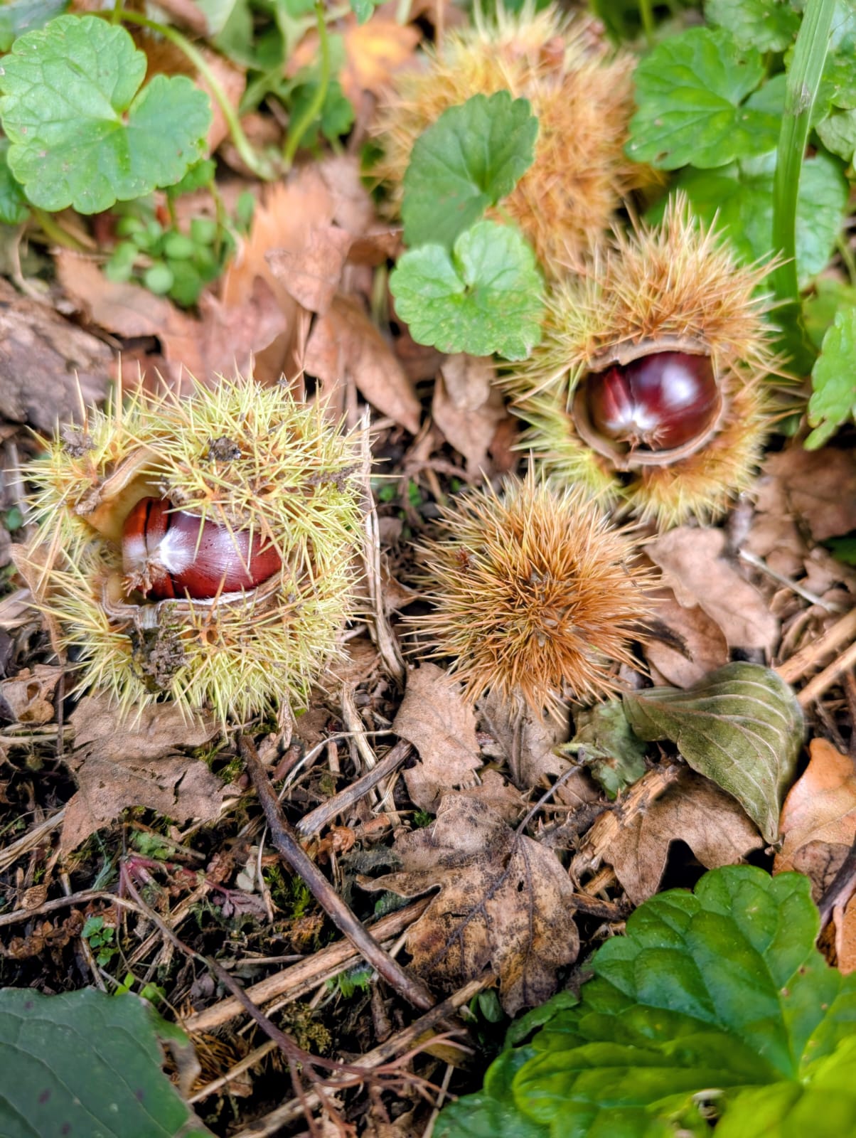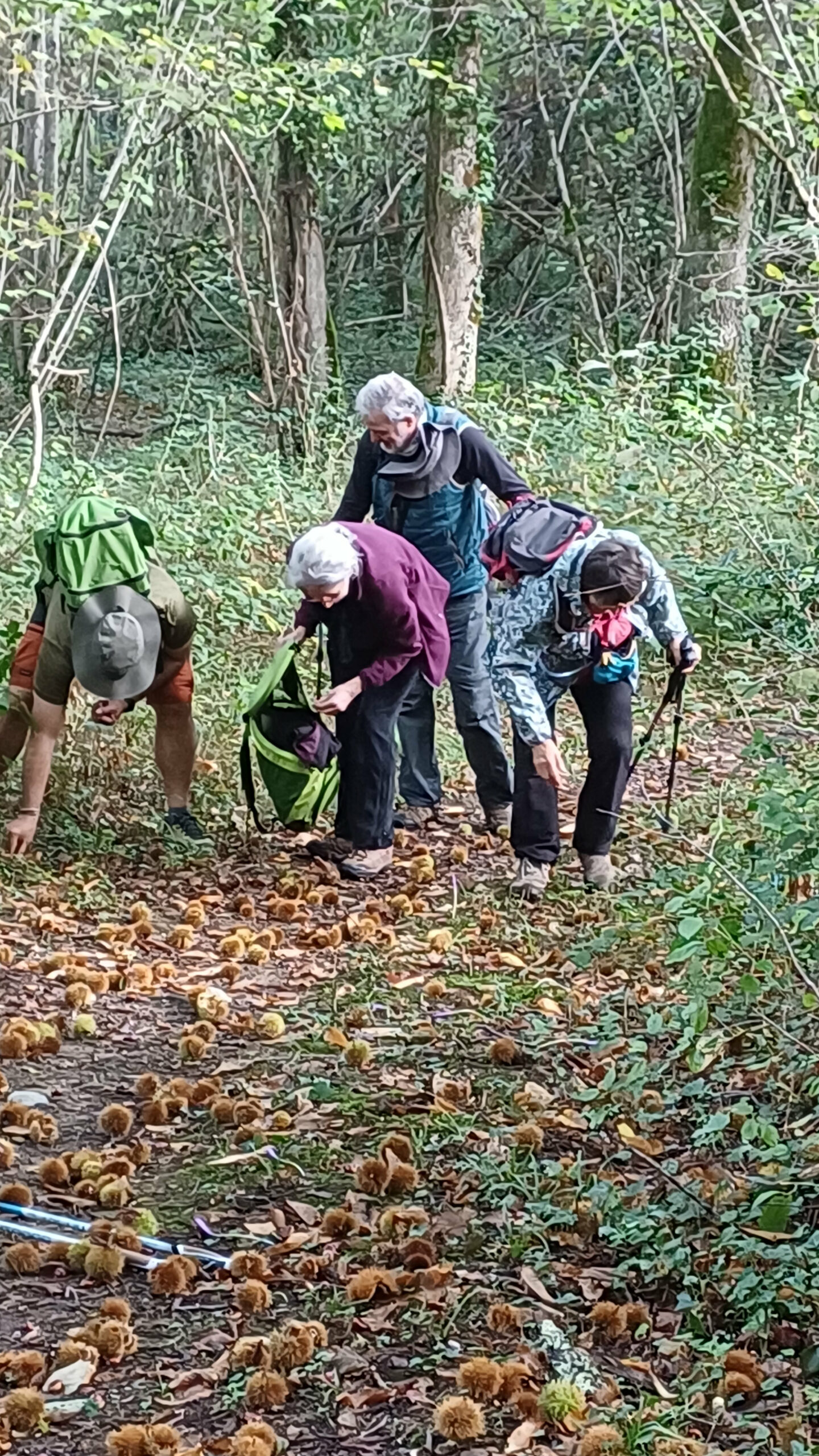 Sous la futaie de châtaigniers, notre groupe se transforme et devient une tribu de castanéi-ramasseurs. L’esprit Gargas flotte, attention de ne pas perdre nos phalanges. Nous continuons de progresser avec notre petite récolte ramassée sur le sentier.