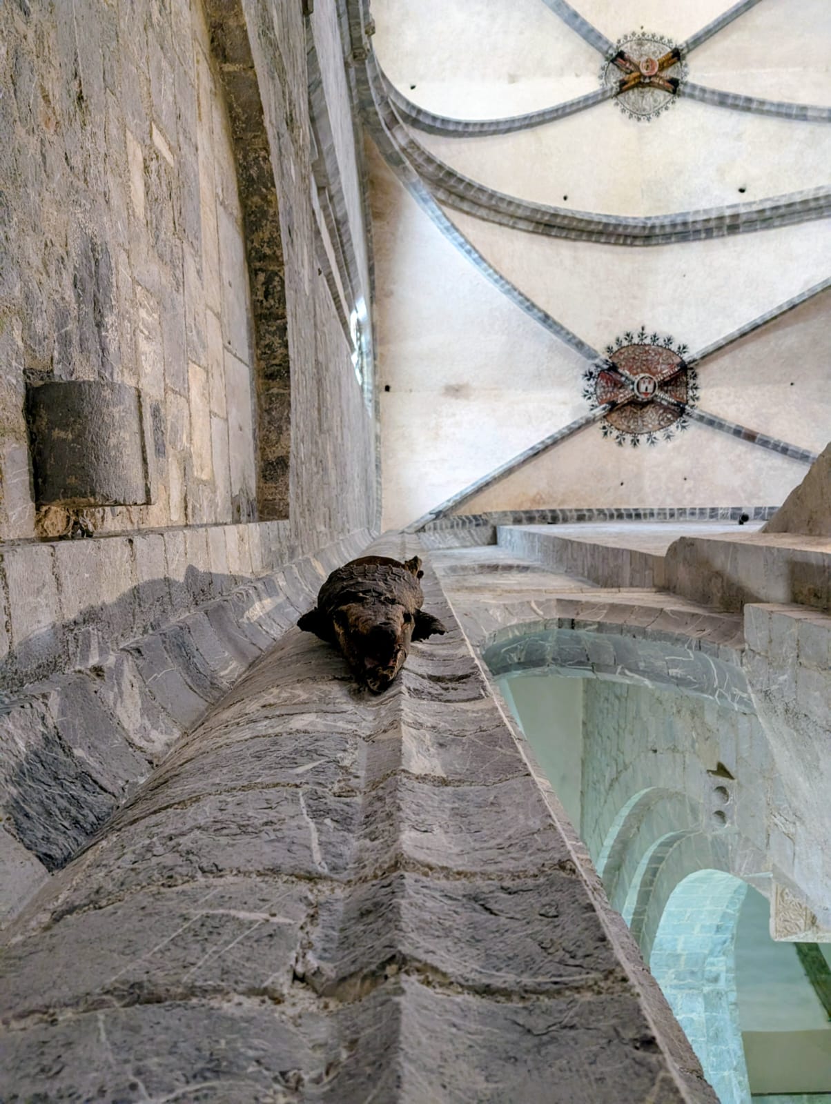 Nous réalisons l’ascension vers la ville haute par le sentier de la face Sud-Ouest et nous apercevons en hauteur le cloitre et la cathédrale Notre Dame.