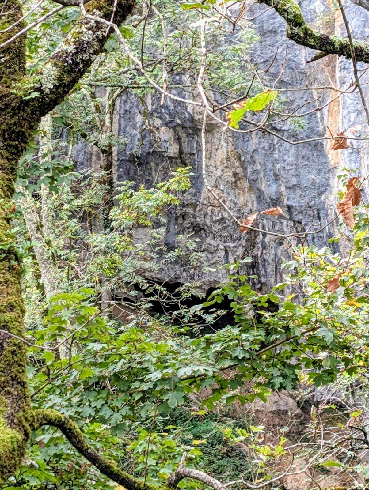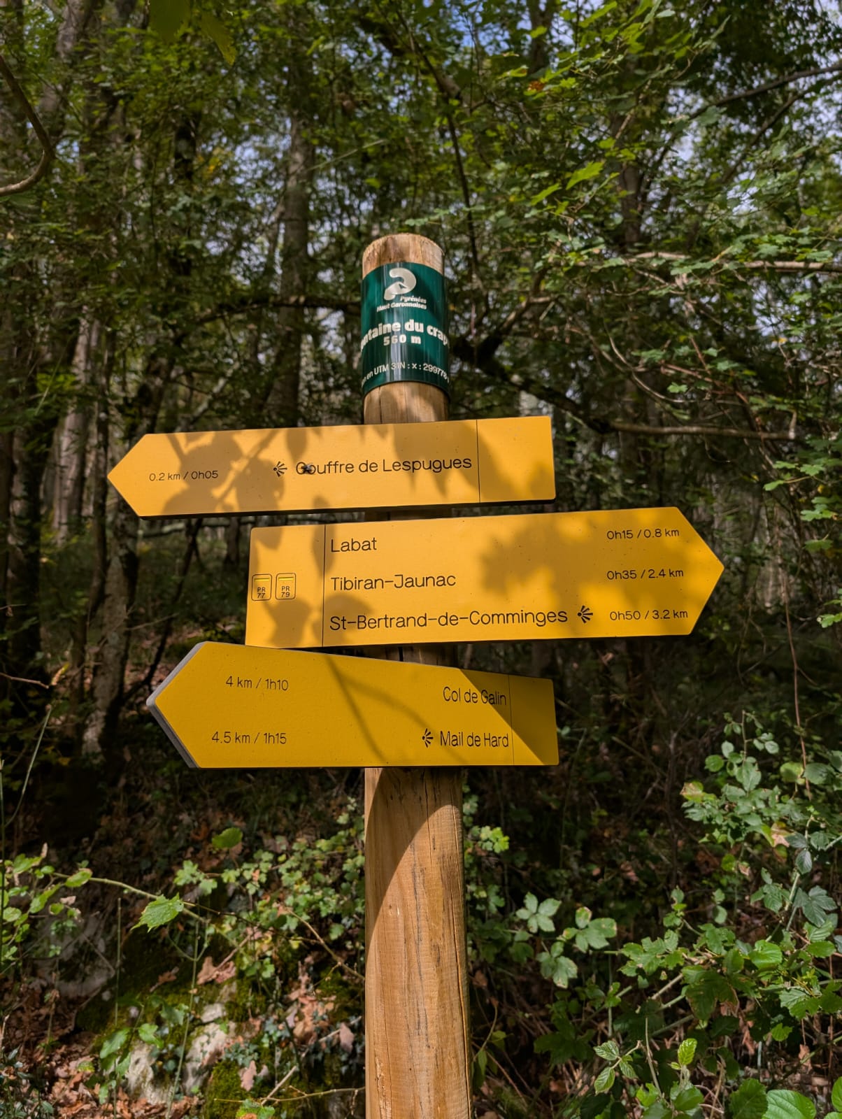 La montée d’une centaine de mètres pour le gouffre de Lespugues, sur un sentier balisé PR, nous attend après la fin du repas. Dans la montée avec quelques gouttes de pluie, nous croisons une chienne de chasse perdue, malgré son antenne GPS. Elle nous a suivis jusqu’au gouffre. Après l’avoir désaltérée, elle nous quitte lorsqu’elle entend une meute canine aboyant.