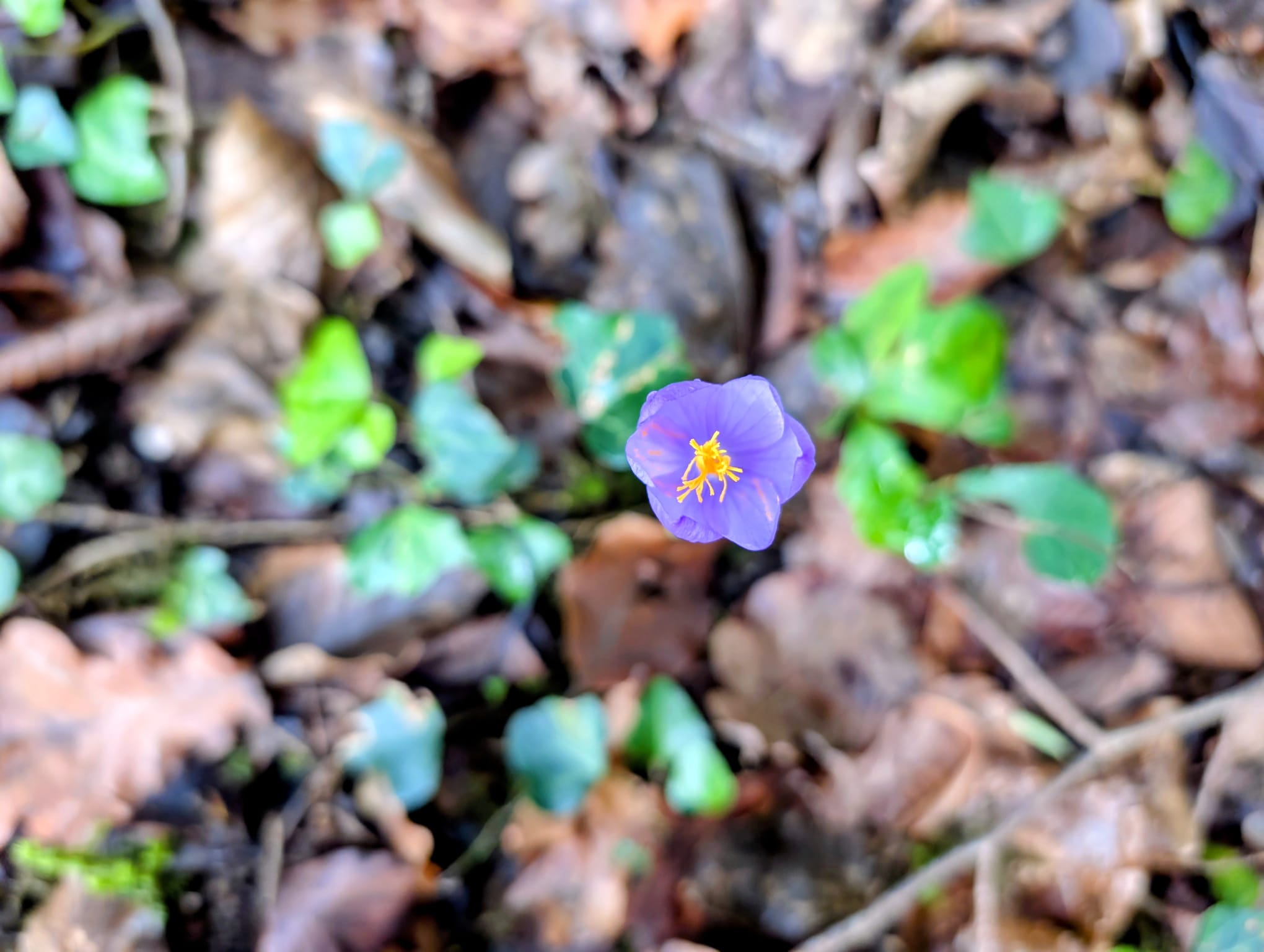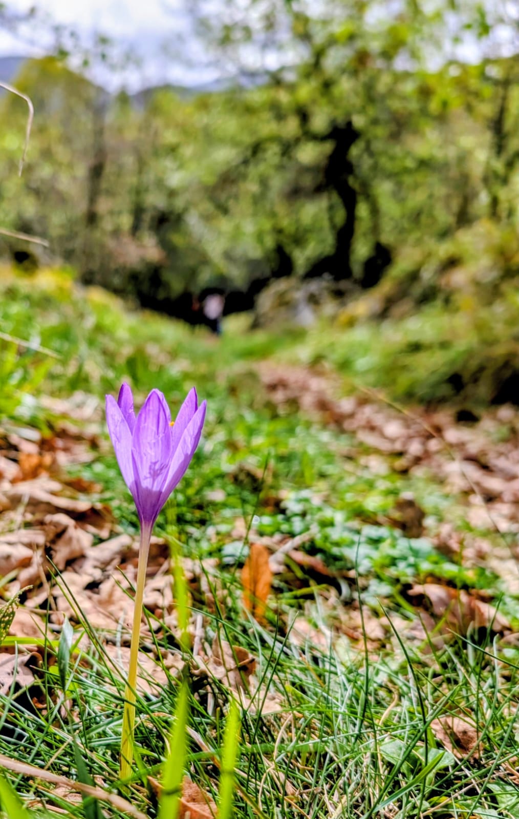Nous attaquons nos deux petits premiers cols sous les arbres. Nous cheminons au milieu de nombreux crocus encore endormis attendant les rayons de soleil matinaux pour se redresser fièrement.