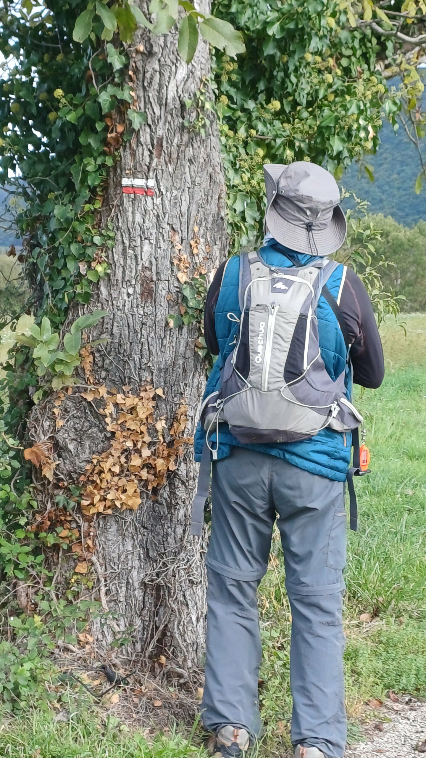 Nous terminons nos 18 km par une piste cyclable en pente douce vers Loures Barousse. Après sa journée d’histoire, de poésie et de techniques sur le balisage notre ex-baliseur contemple nostalgique son dernier nettoyage des marques de la journée.