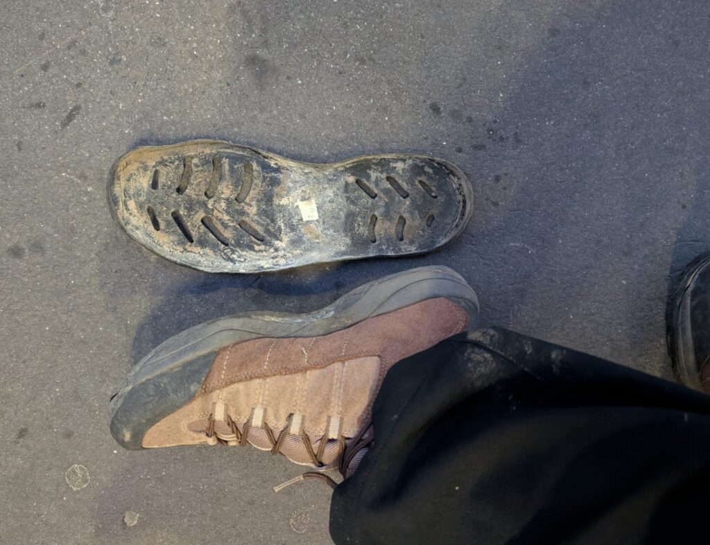 Juste après notre redémarrage, une chaussure veut retrouver les sensations préhistoriques de la marche, un talon de semelle se décolle. Cette dernière s’échappera définitivement quelques kilomètres plus loin.