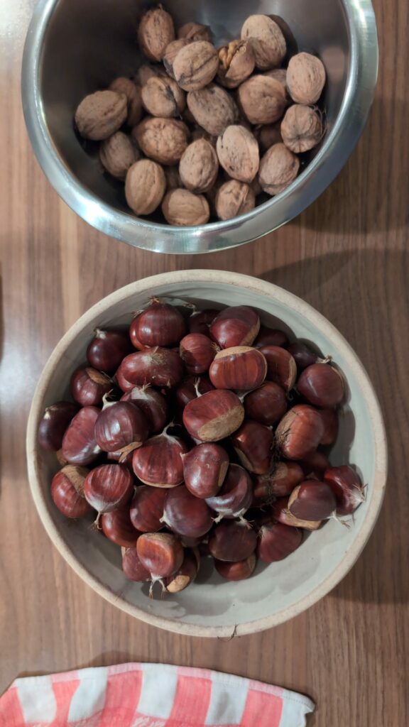 Le retour à un comportement antérieur à la culture et les supermarchés se manifeste à nouveau, nous devenons nuci-ramasseurs (un petit néologisme pour ramasseur de noix). Des sacs s’alourdissent à nouveau.