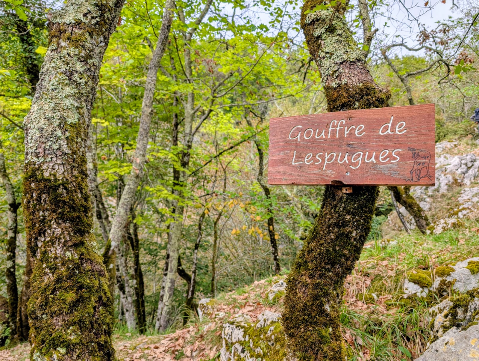 À nos pieds, enfin le gouffre attendu, il s’agit d’une cavité recouverte de végétation de la taille d’un terrain de rugby. À l’origine, il s’agissait d’une caverne dont le plafond s’est un jour effondré. D’ailleurs la toponymie de Lespugues signifie « caverne ».