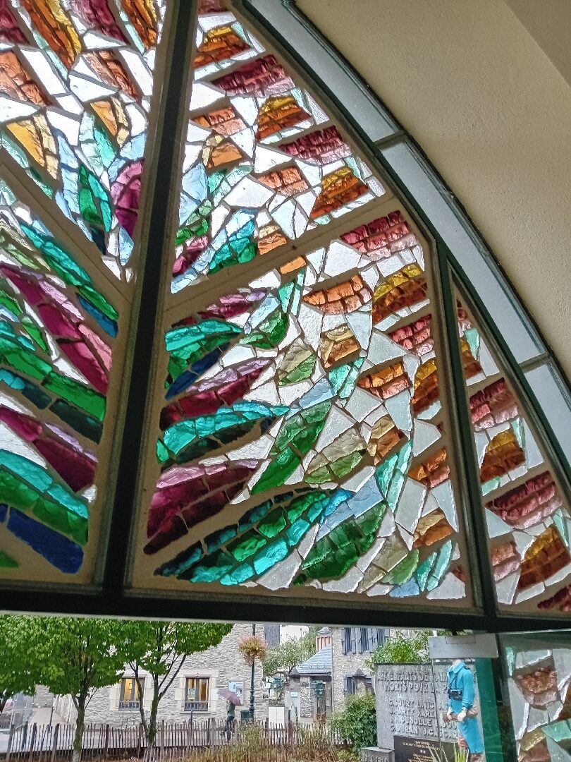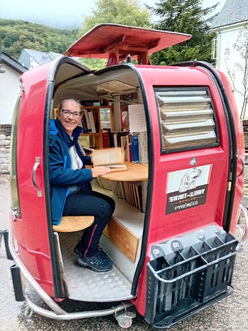 – Dans le jardin, une télécabine est transformée en boîte à livre.
