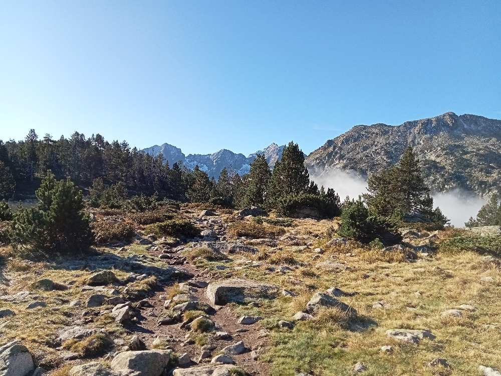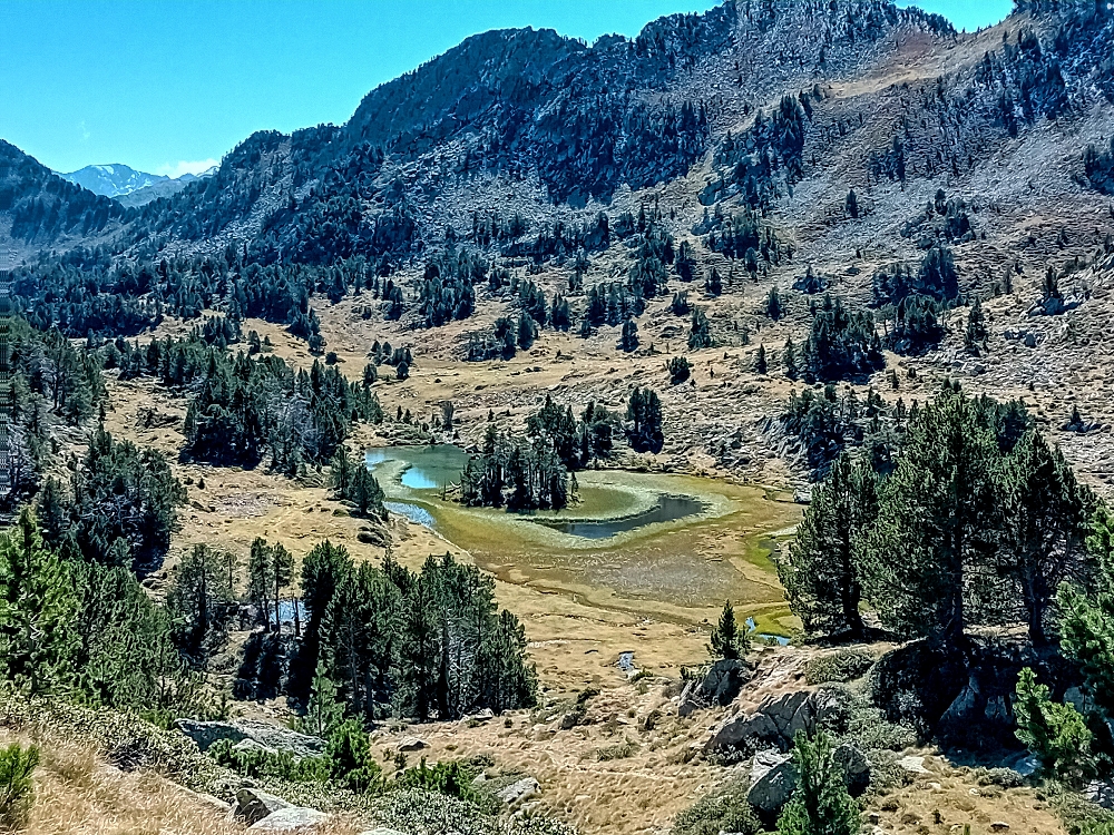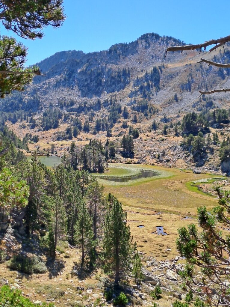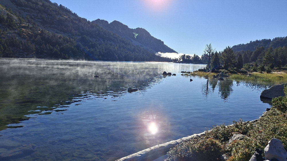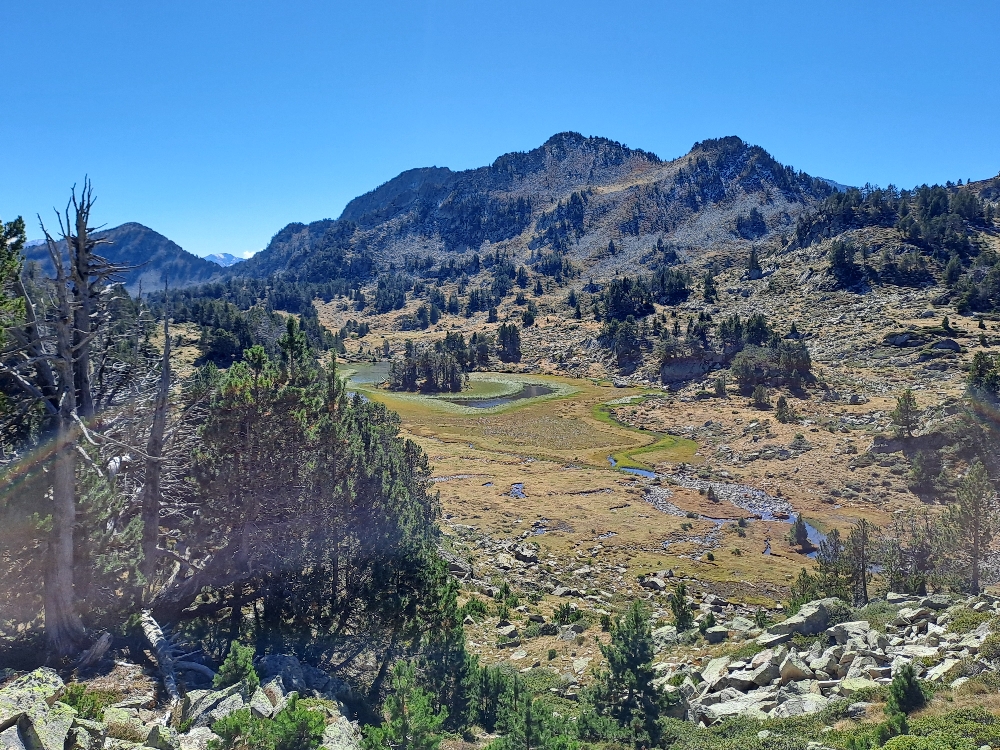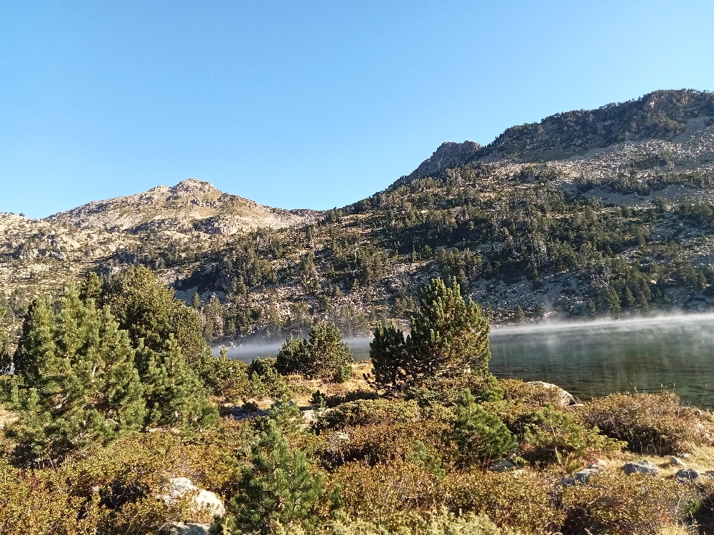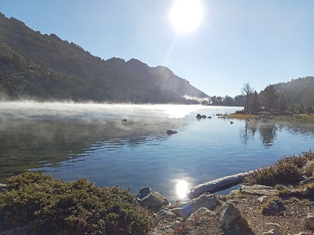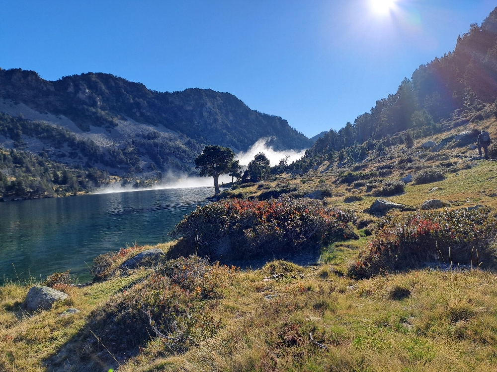 Une brume rase le lac d’Aumar que nous longeons par le sud-ouest, histoire de nous échauffer avant de grimper le col et ses 175 m de dénivelé assez raide. Au col, le lever de rideau sur le vallon d’Estibère et sa série de laquettes est irrésistible, on a très envie d’y descendre et de s’approcher de cette nature sauvage.
