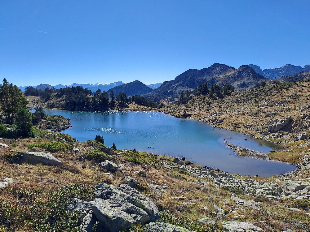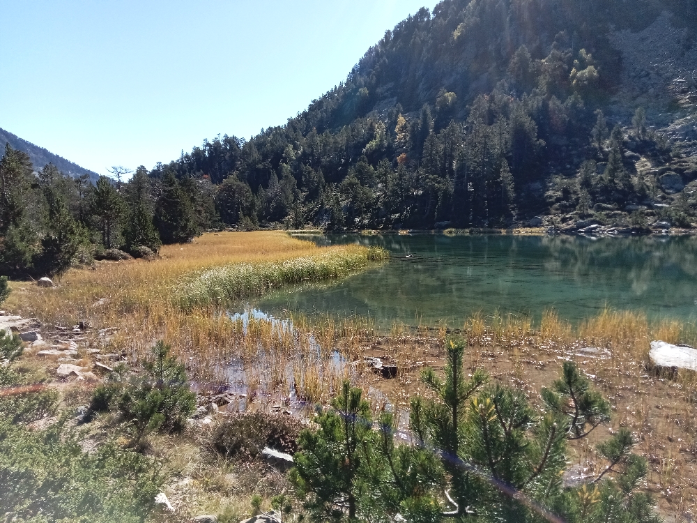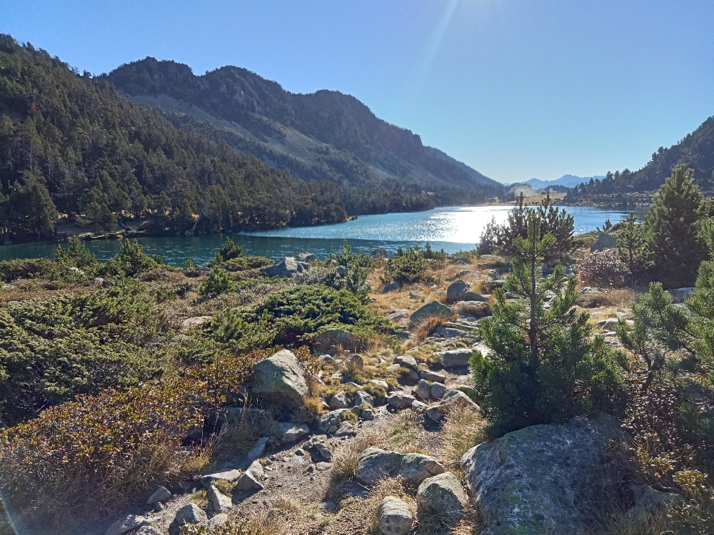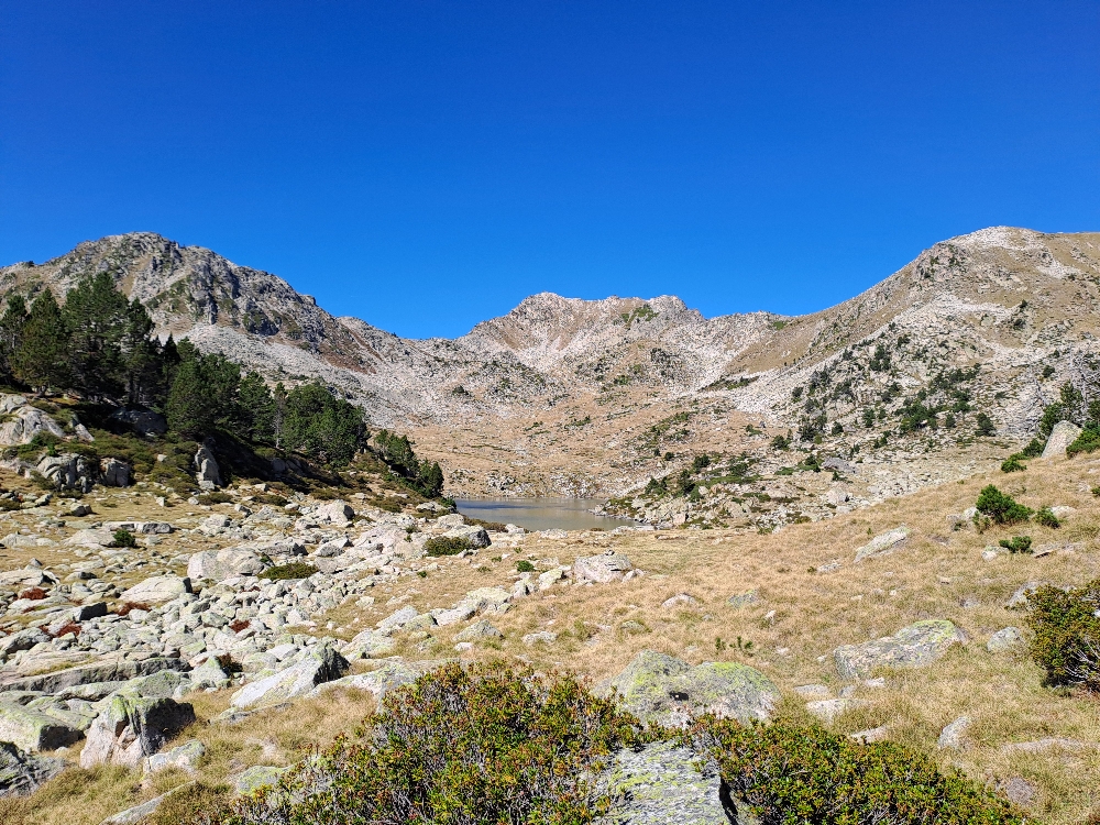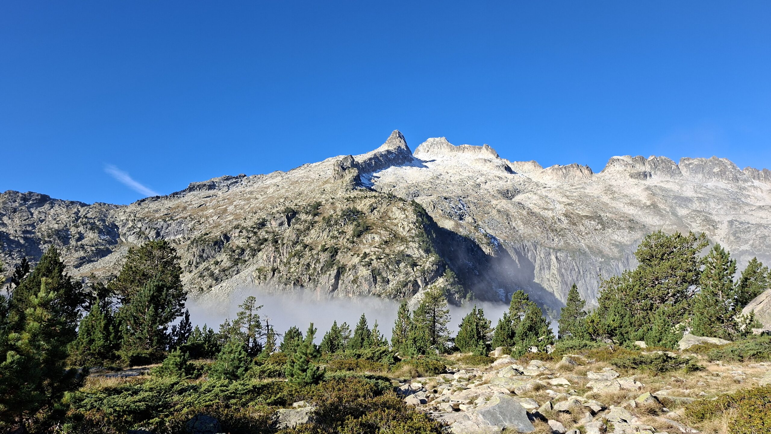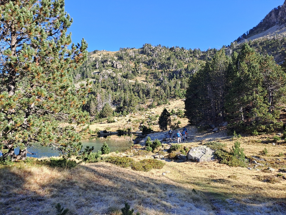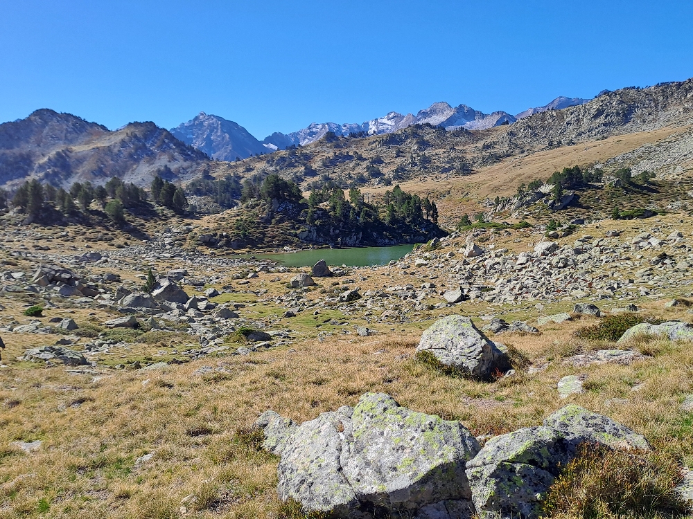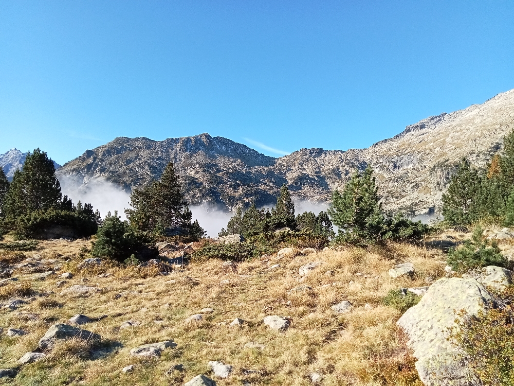 Une brume rase le lac d’Aumar que nous longeons par le sud-ouest, histoire de nous échauffer avant de grimper le col et ses 175 m de dénivelé assez raide. Au col, le lever de rideau sur le vallon d’Estibère et sa série de laquettes est irrésistible, on a très envie d’y descendre et de s’approcher de cette nature sauvage.