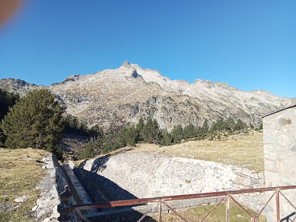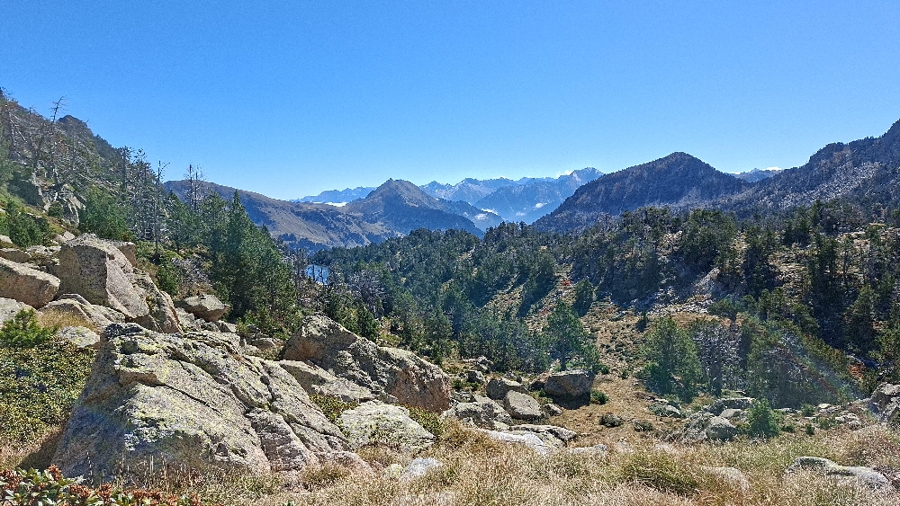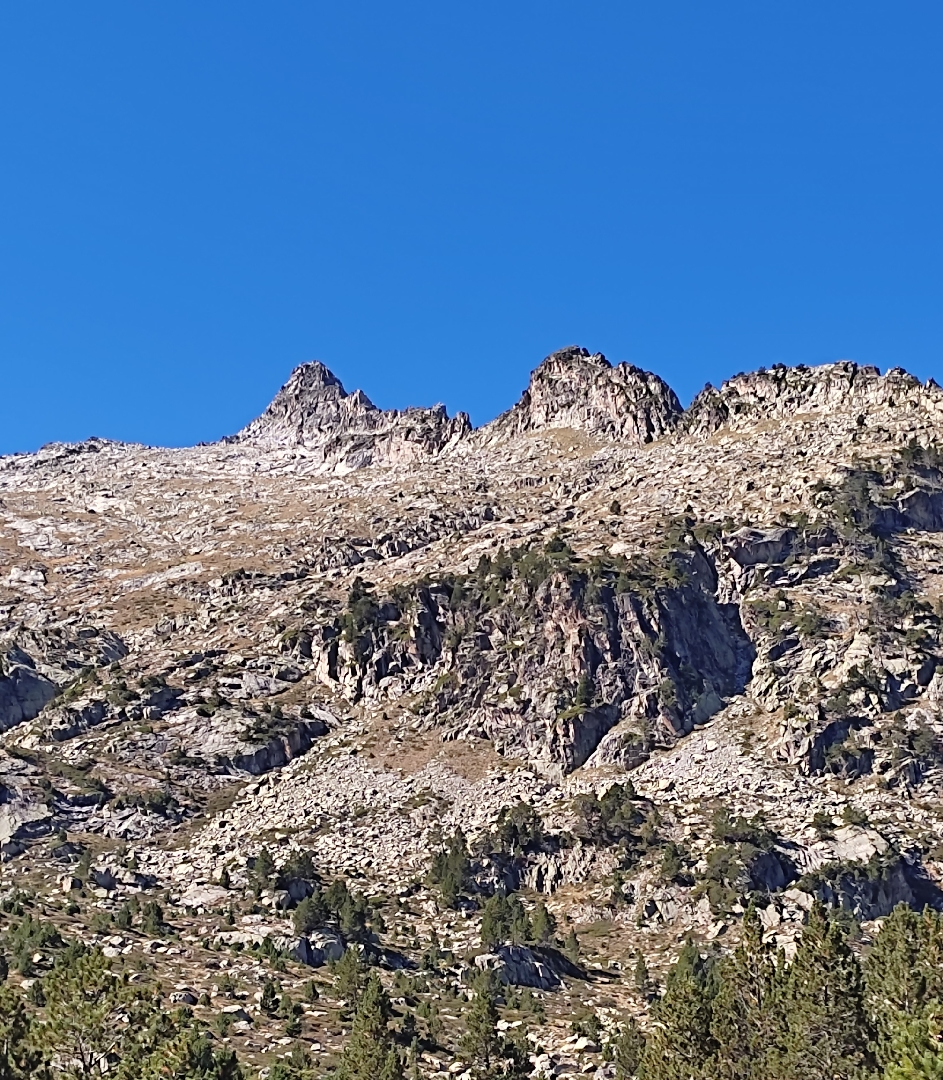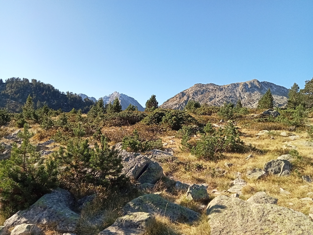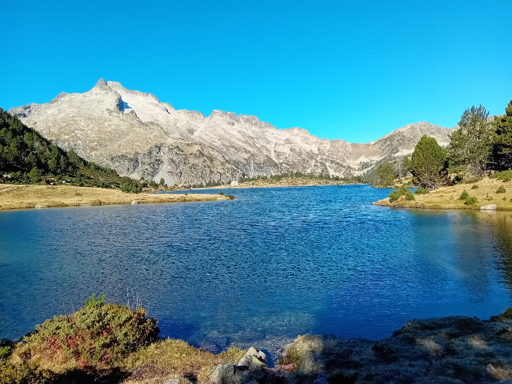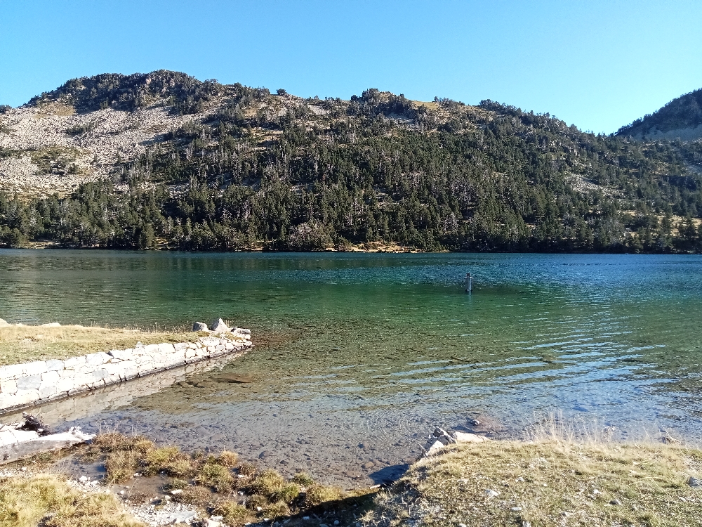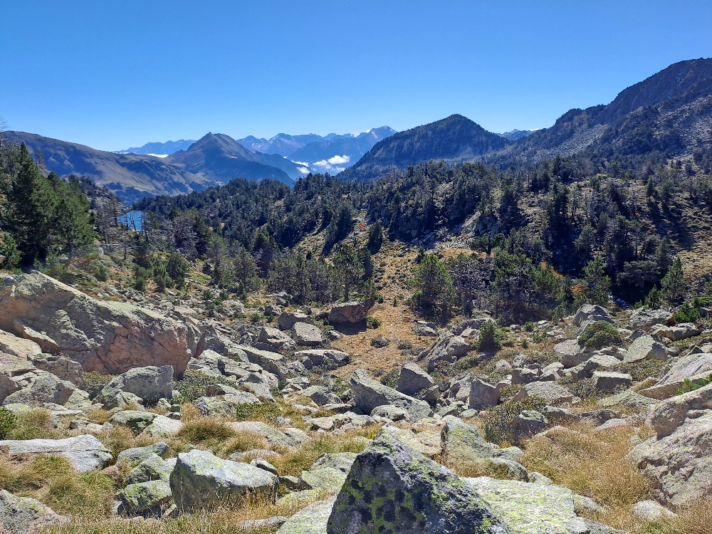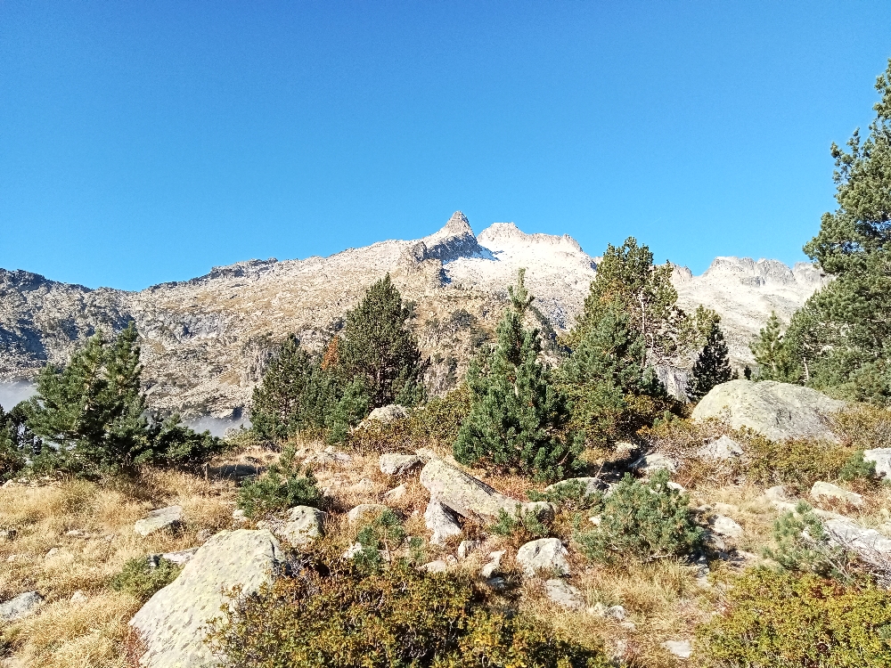 Une brume rase le lac d’Aumar que nous longeons par le sud-ouest, histoire de nous échauffer avant de grimper le col et ses 175 m de dénivelé assez raide. Au col, le lever de rideau sur le vallon d’Estibère et sa série de laquettes est irrésistible, on a très envie d’y descendre et de s’approcher de cette nature sauvage.