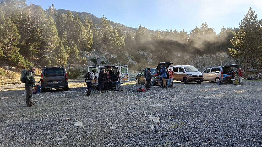 Partis à 7 en voiture depuis St Lary, nous stationnons au parking près du lac d’Aubert accessible en voiture en cette période de l’année, plutôt que de partir du lac d’Orédon pour atteindre le lac d’Aubert en passant par les Laquettes, ce qui aurait rajouté 300 m de dénivelé.