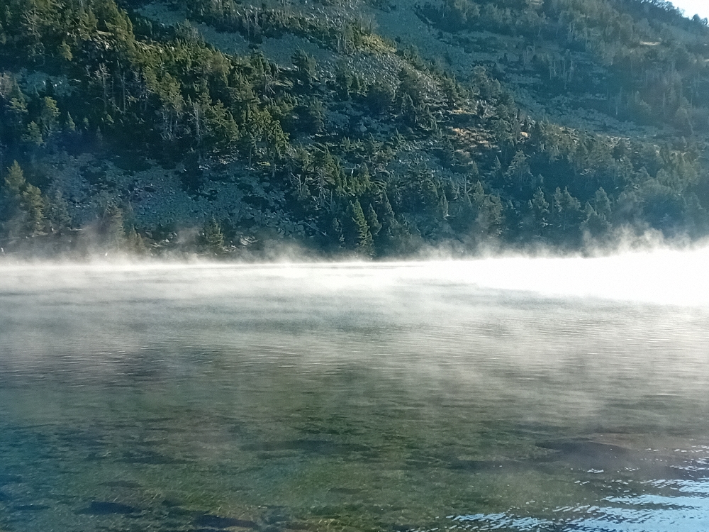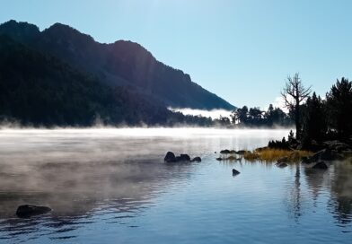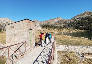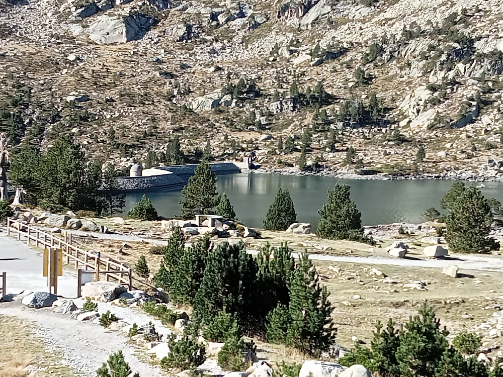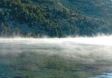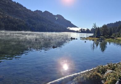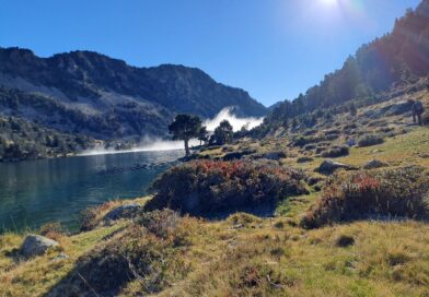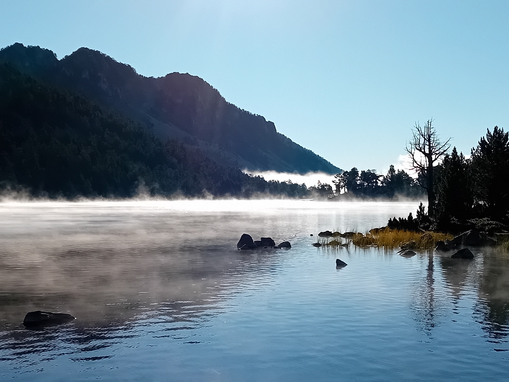 La brume est encore présente dans les parties basses du massif du Néouvielle. Nous commençons la journée en longeant le GR 10 sur les bords du lac d’Aumar jusqu’au point de déversement. La brume matinale joue avec le soleil sur les eaux du lac. Puis nous faisons demi-tour pour rejoindre le bord du lac d’Aubert jusqu’au barrage.