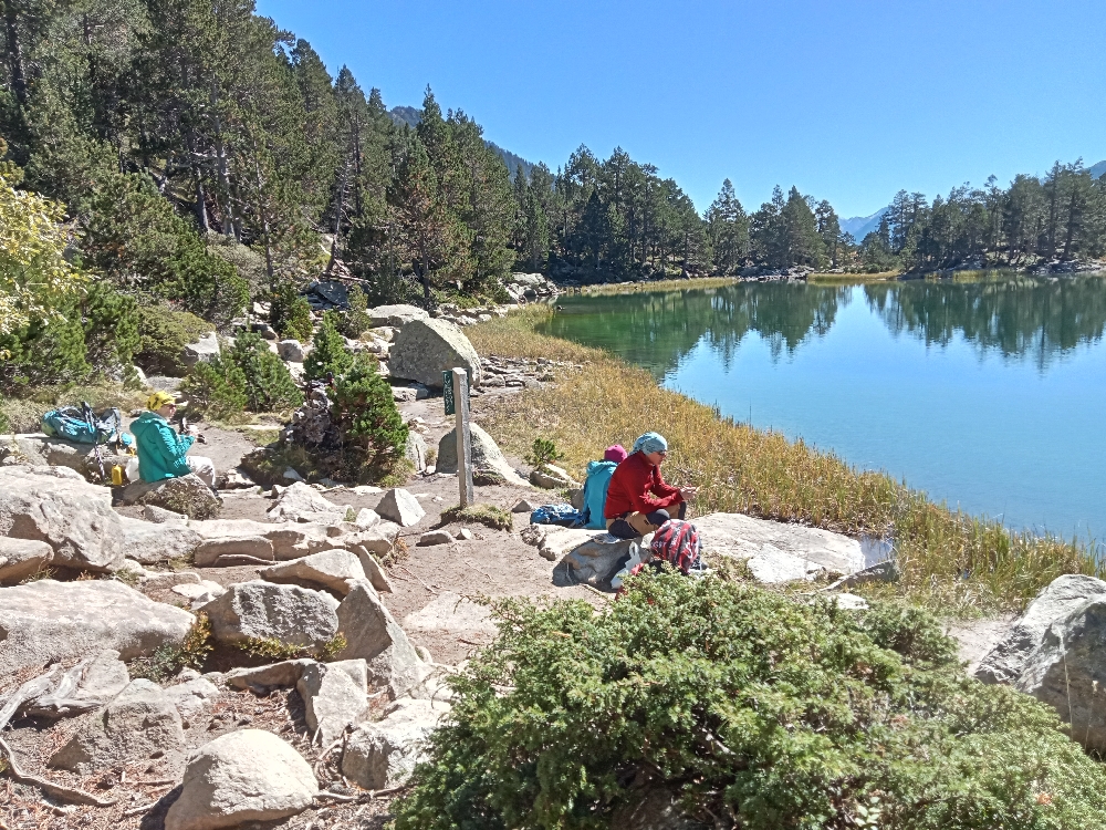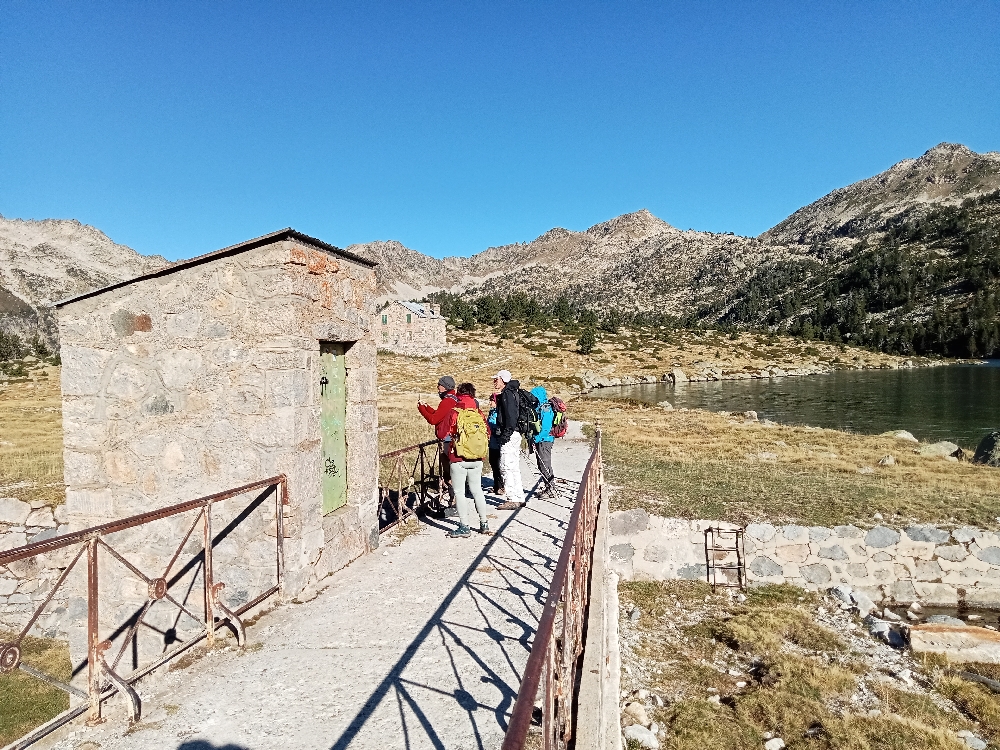 Le groupe du séjour à Saint-Lary s’étant donc réparti en deux sous-groupes égaux en nombre, c’est un groupe de 7 randonneurs et randonneuses composé des habitués respectifs des niveaux 1 ou 2 et de ceux de la haute randonnée qui a choisi de s’évader vers le vallon d’Estibère. Ce vallon méconnu est accessible depuis le lac d’Aumar par un sentier non balisé qui franchit le col du même nom à 2 274 m d’altitude. Nous avons laissé les voitures au parking de la réserve naturelle de Néouvielle situé entre les lacs d’Aumar et d’Aubert à 2 381 m. À 9 h, il fait encore froid puisqu’il gèle à cette altitude malgré le soleil rayonnant sur le massif et ses lacs.