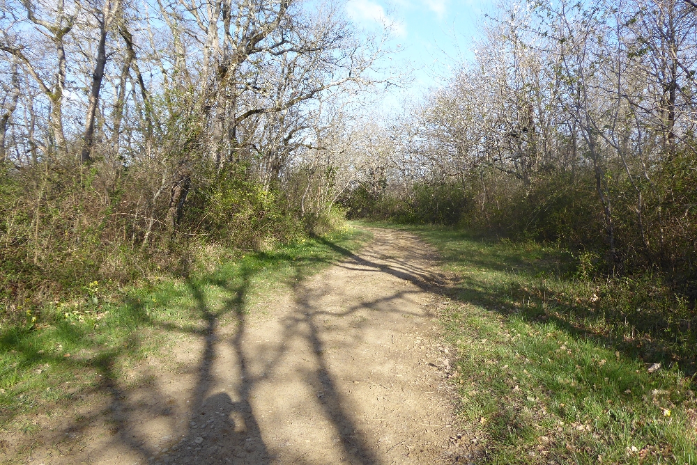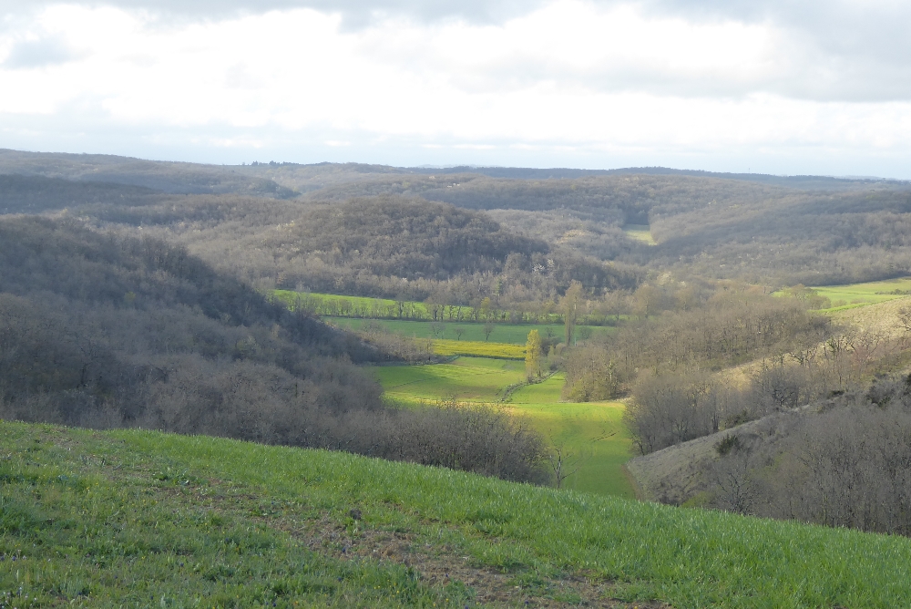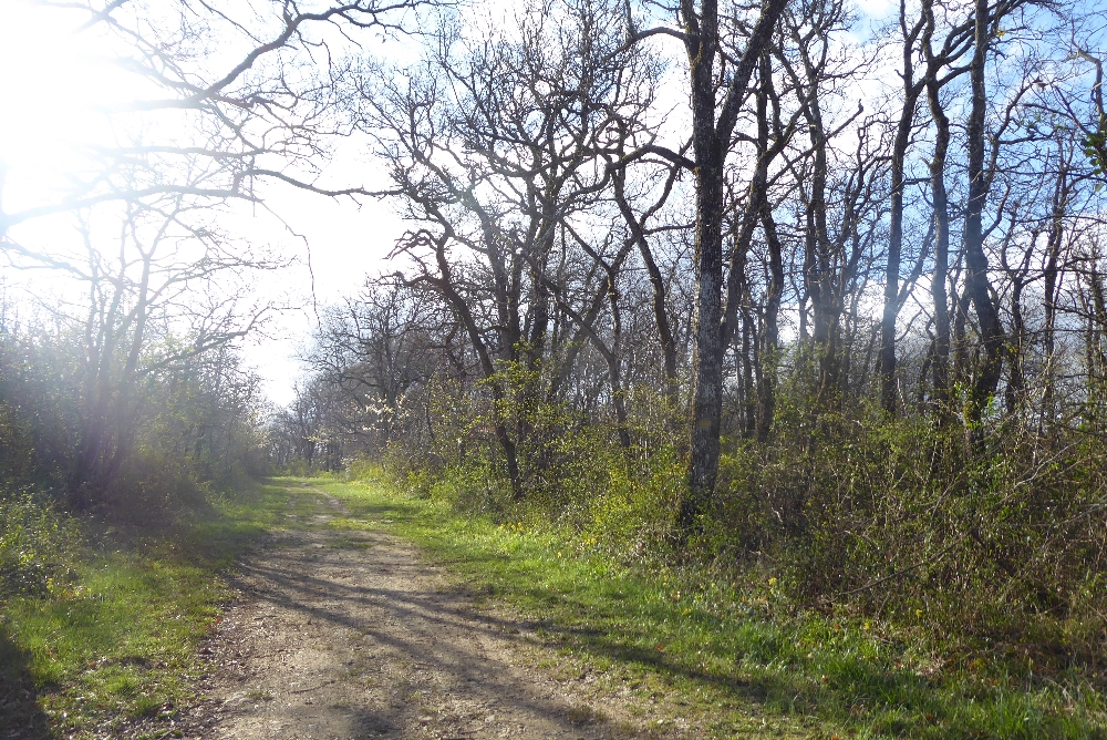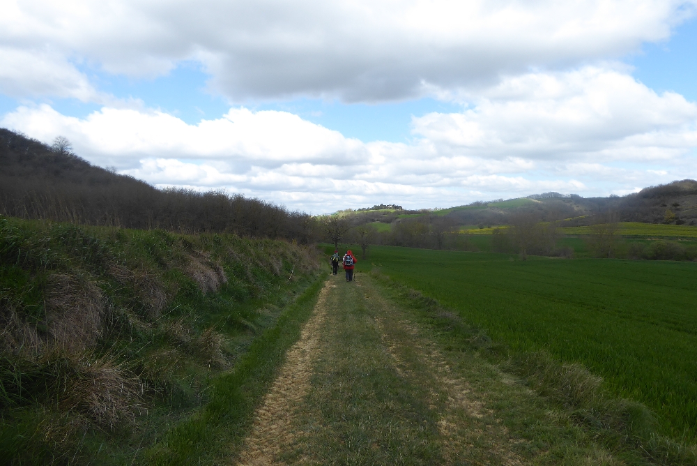 Nous commençons par une petite route qui nous fait traverser le village. Puis nous montons sur de bons chemins sur une petite crête qui nous permettrait de voir les Pyrénées s’ils n’étaient pas sous les nuages. Des primevères sauvages (ou coucous) nous accompagnent tout au long de la randonnée.