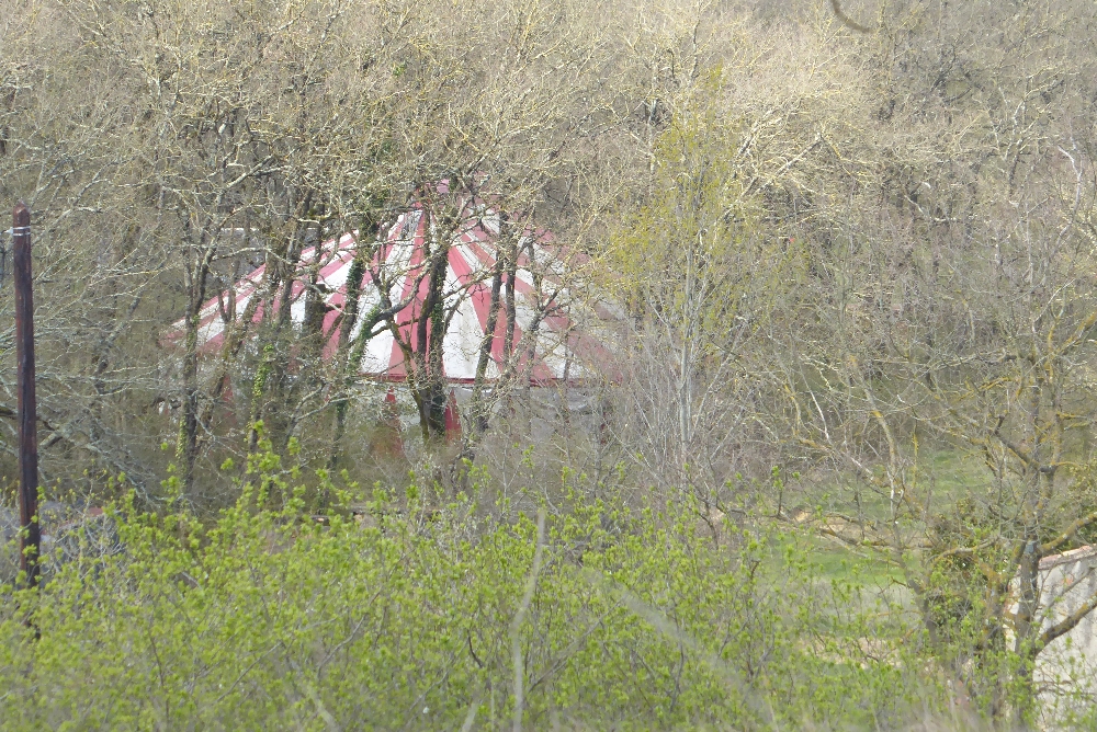 Plus tard nous voyons dans des champs (vers Saint-Henri) des structures vertes ressemblant à des caravanes puis un chapiteau au milieu des arbres, lieu où se déroule « l’ATOMfestival » fin août tous les 2 ans. Une œuvre nous indique l’entrée de ce site.