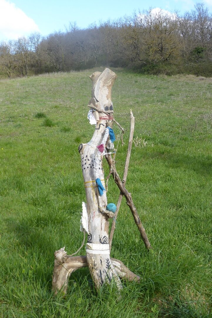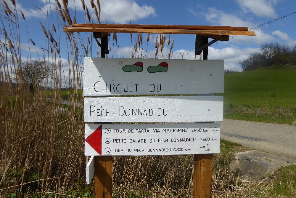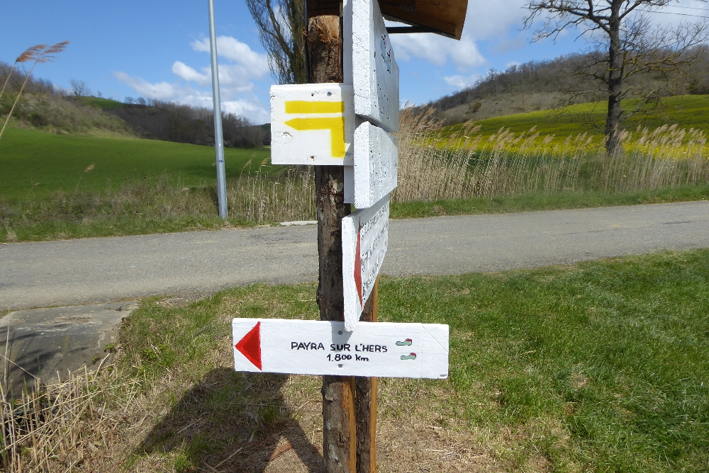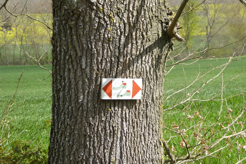 Le balisage est un peu particulier sur ce chemin, il est constitué de petit panneau de bois blanc sur lequel on a peint les indications et mis sur des poteaux, arbres ou autres supports. Nous avons aussi vu un panneau avec « deux chaussettes » pour moi, à vous de voir ?