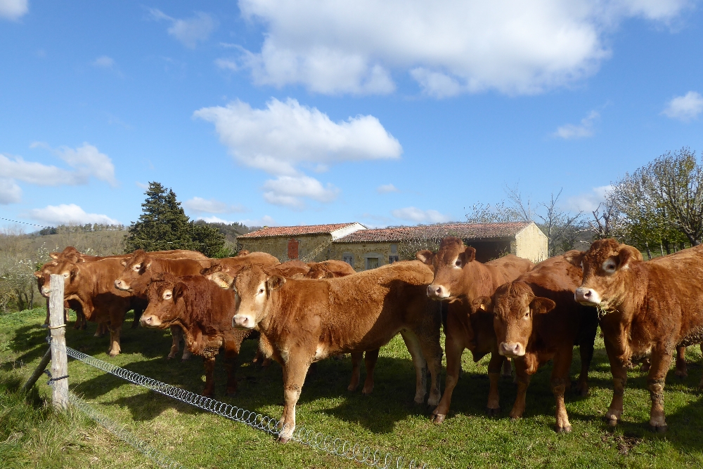 En chemin nous avons longé une belle propriété fraîchement reclôturée sur 2 m de hauteur. Puis nous rencontrons un troupeau de jeunes vaches limousines dans leur enclos. Elles auraient bien voulu nous suivre.